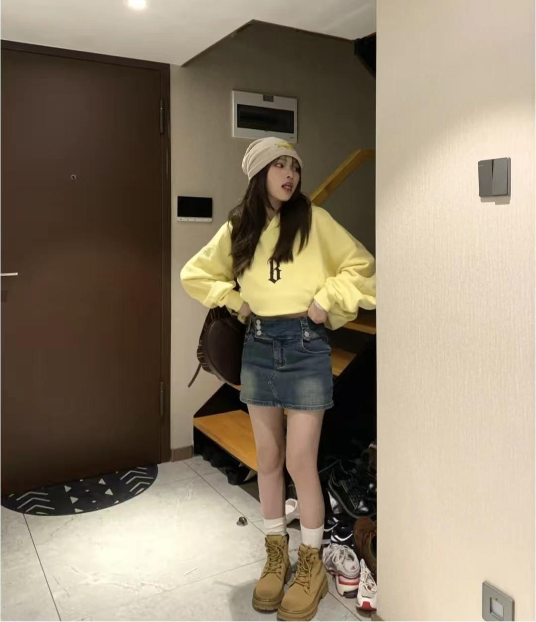 This set of American style The retro style is exactly what a campus heroine should feel like. This yellow color is really tender and not attractive at all. Skirts are also my recent favorite. The distressed denim color can be paired with any fancy top! It’s very stretchy and very comfortable to wear, and it looks good when paired with a sweater.