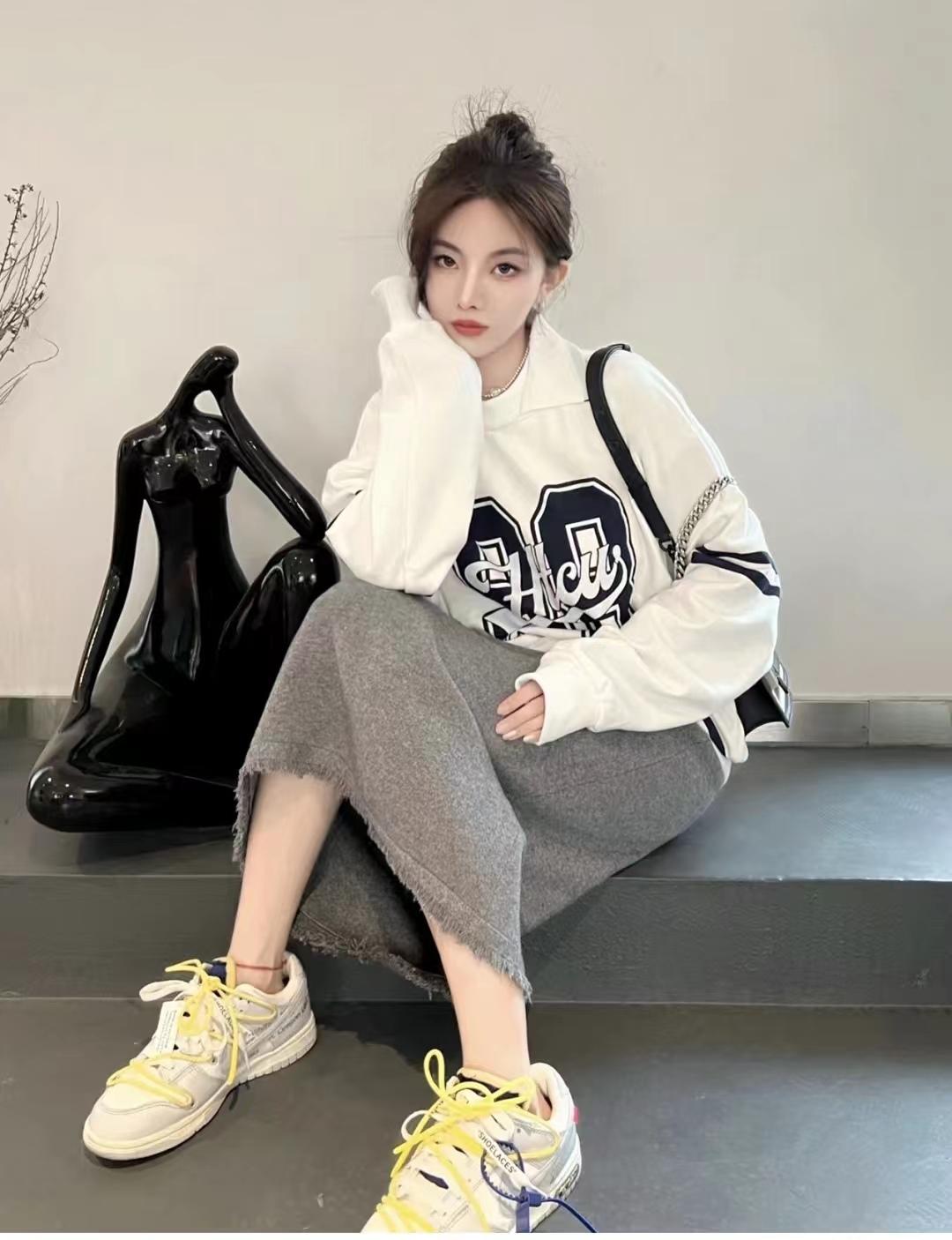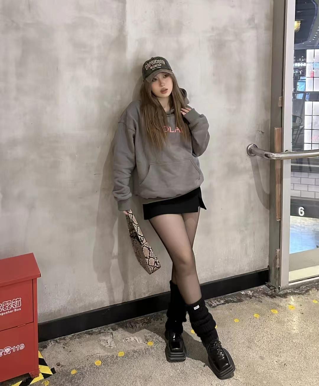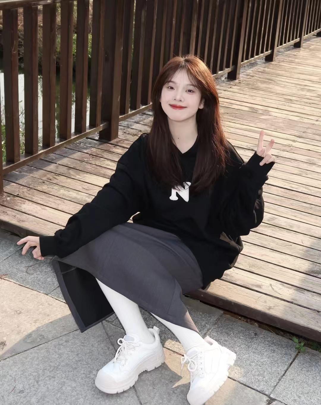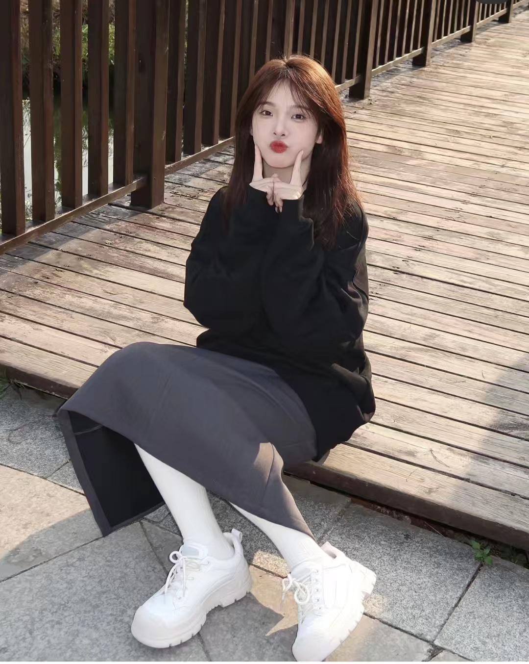 I really like the combination of sweatshirt and skirt: it looks like something fashionable girls wear The sweatshirt has never been paired with pants. I always feel that after paired with a skirt, it will have a more gentle and sweet feeling. The black and gray color is really versatile.