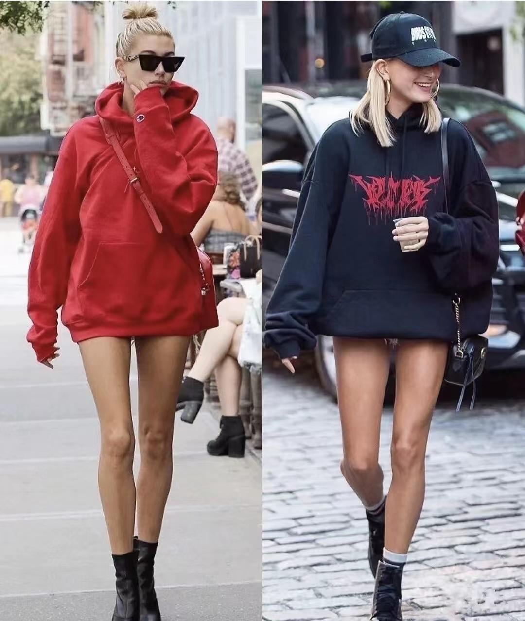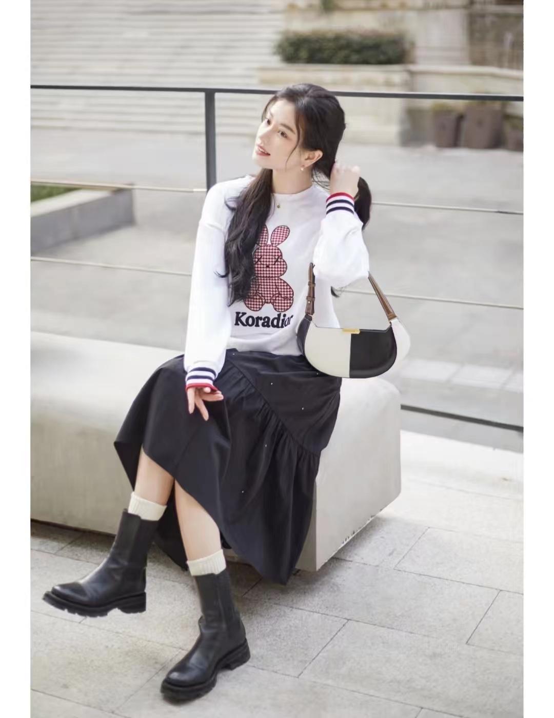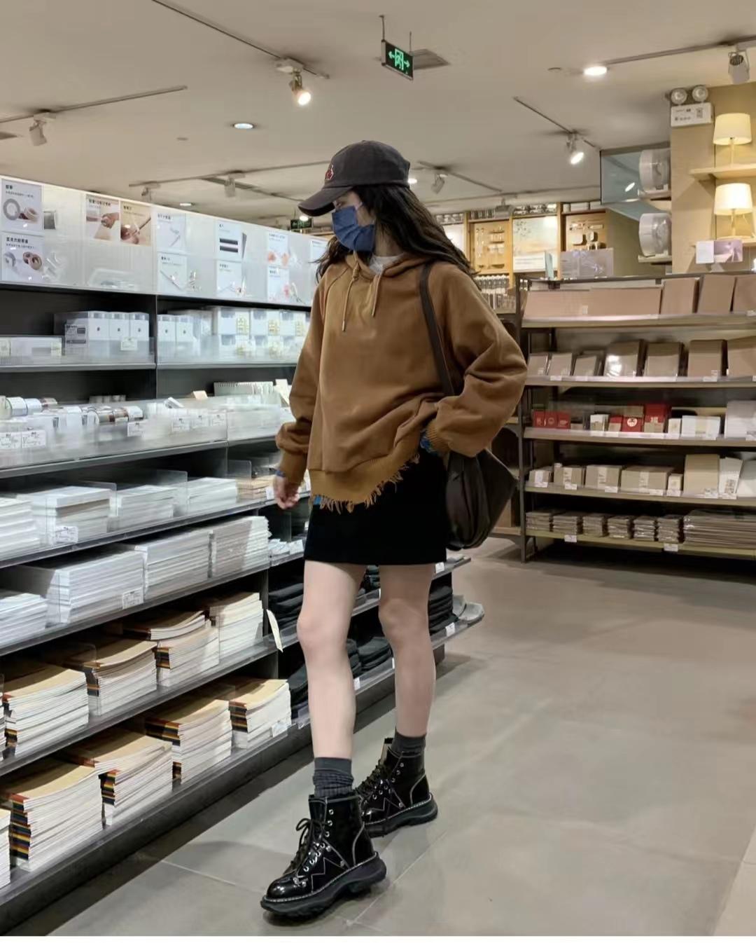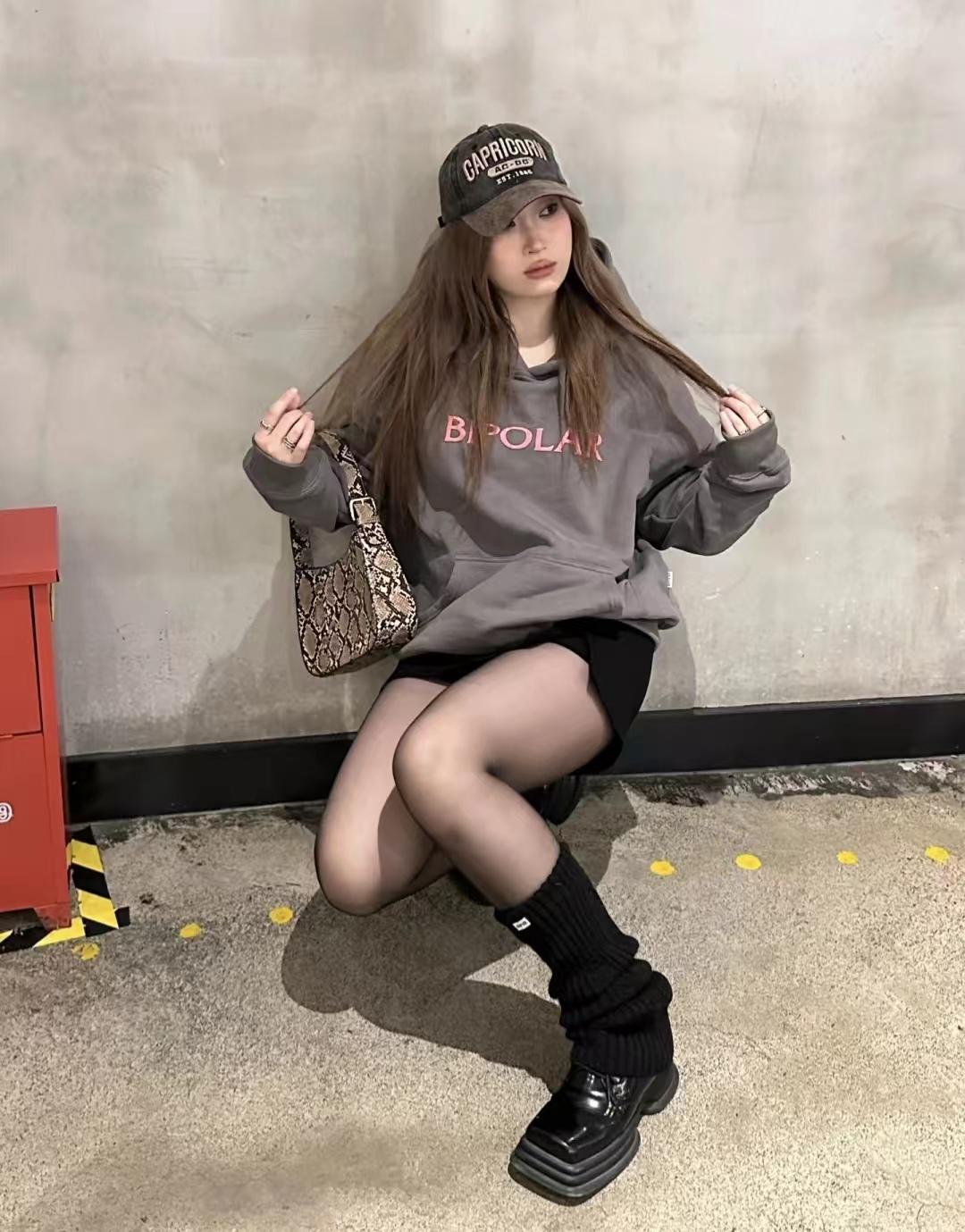 I really like the combination of sweatshirt and skirt: it looks like something fashionable girls wear The sweatshirt has never been paired with pants. I always feel that after paired with a skirt, it will have a more gentle and sweet feeling. The black and gray color is really versatile.