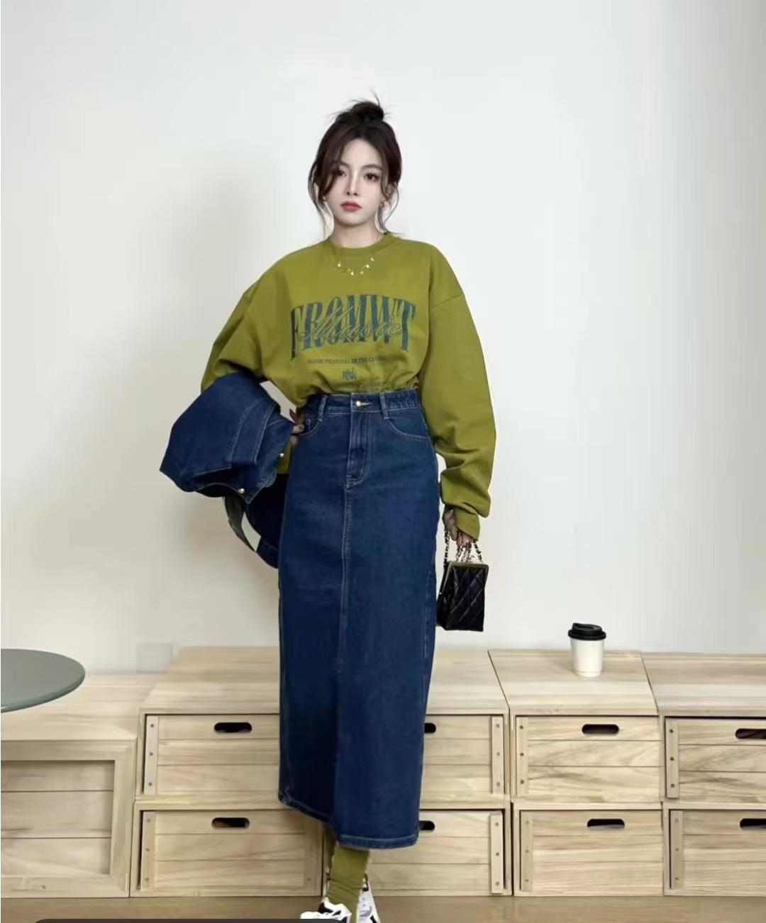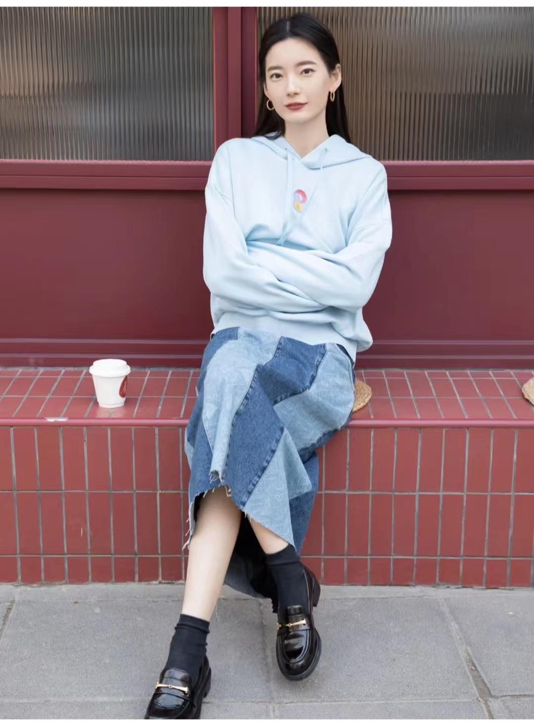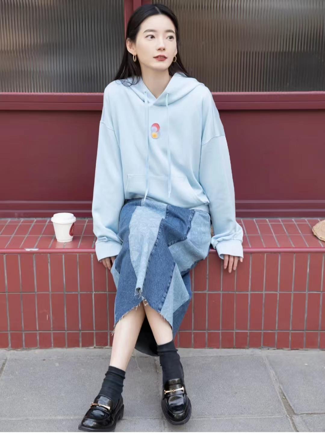 Early spring is perfect for wearing sweatshirts! The light blue sweatshirt gives people a gentle and fresh feeling. Paired with a denim skirt of the same color, it is lazy and fashionable. When paired with a complete set, it becomes more efficient when going out!
