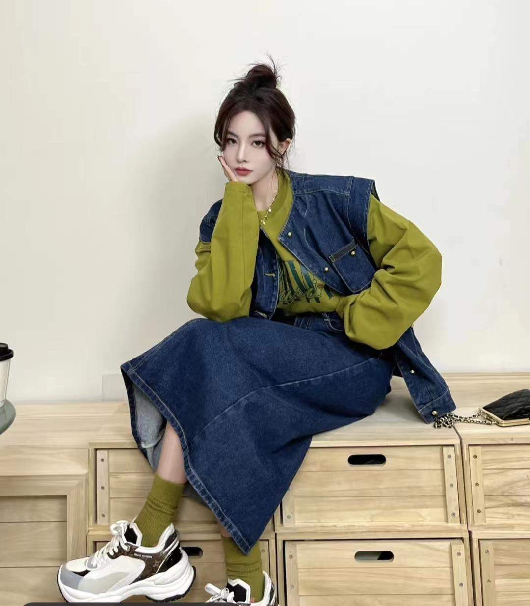 look3 light blue hooded sweatshirt + same color spliced denim bust Skirt