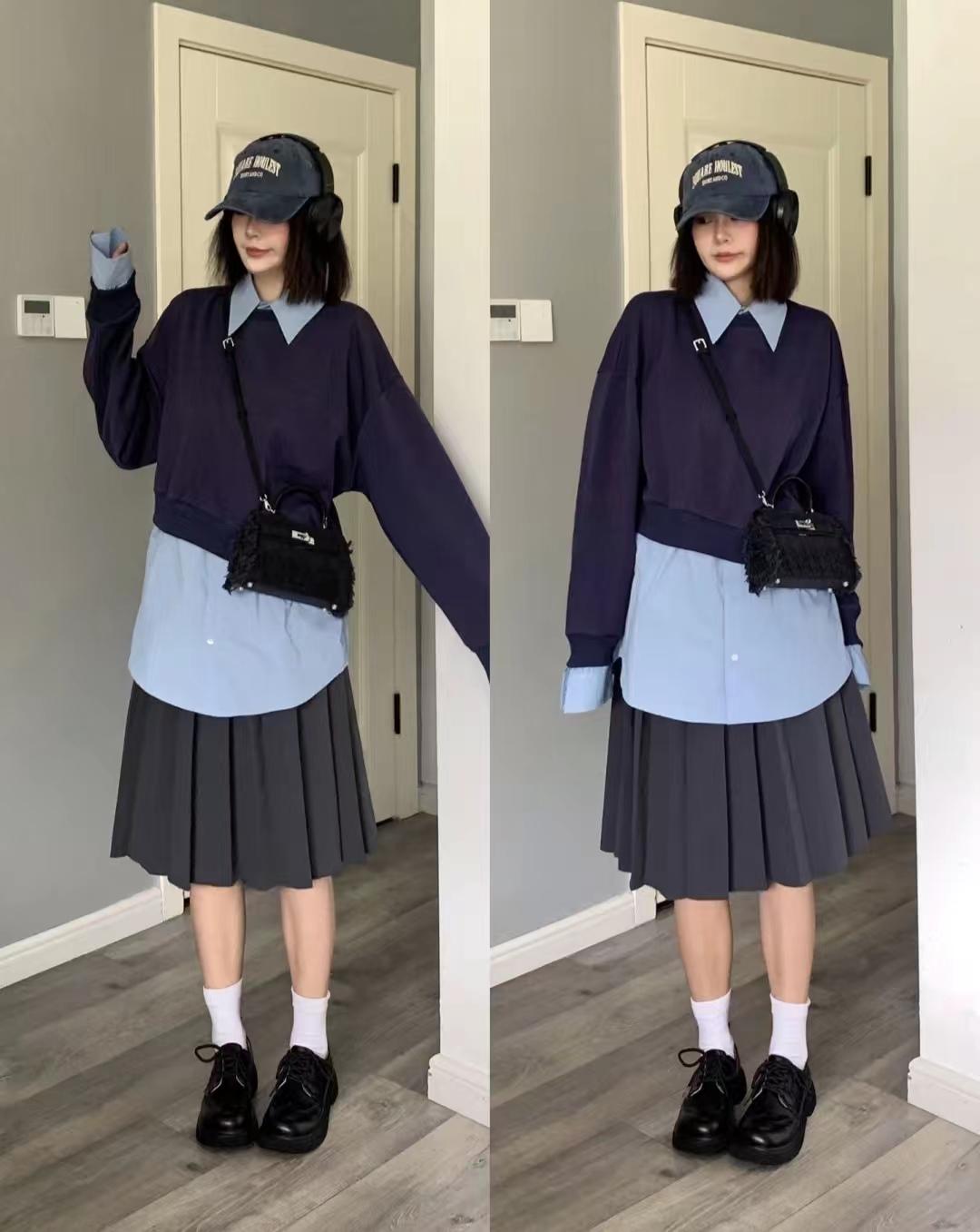 The fake two-piece sweatshirt is really convenient. It has a bit of an age-reducing atmosphere when paired with a gray suit skirt. The whole set is high-end and clean.