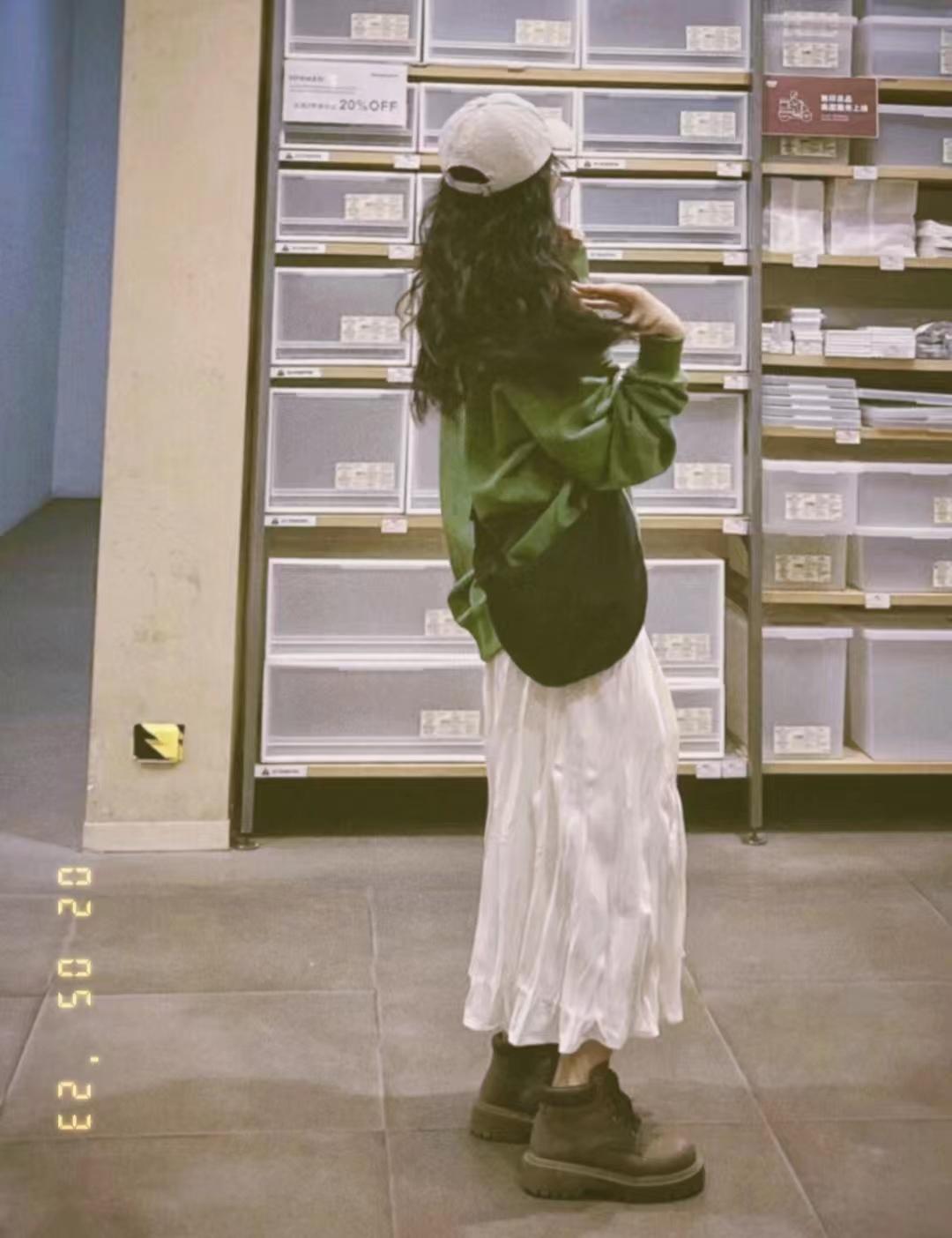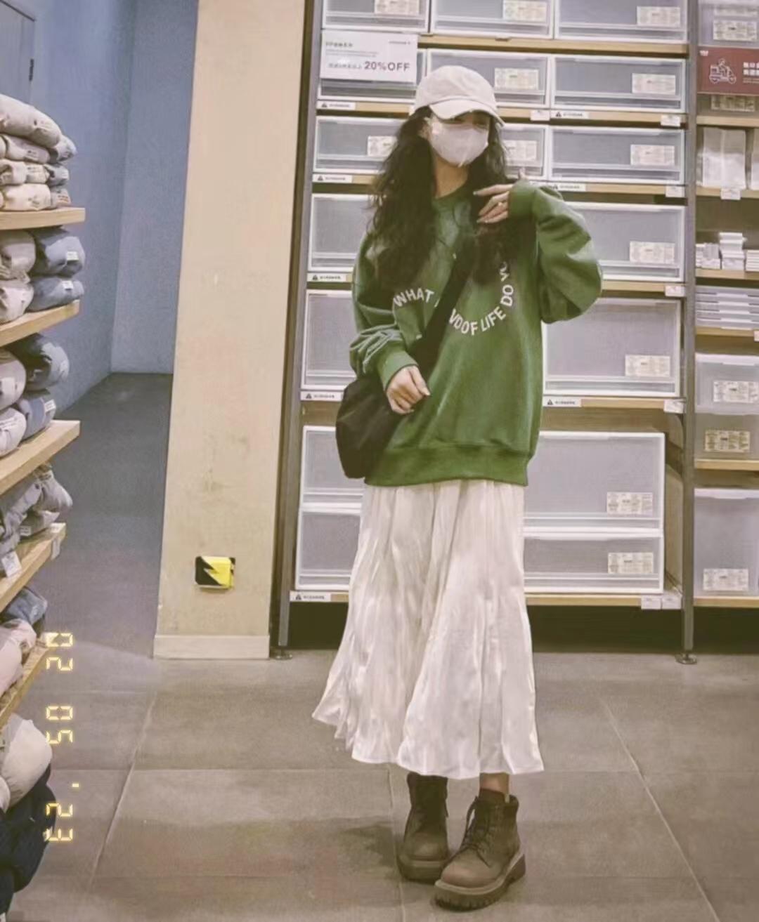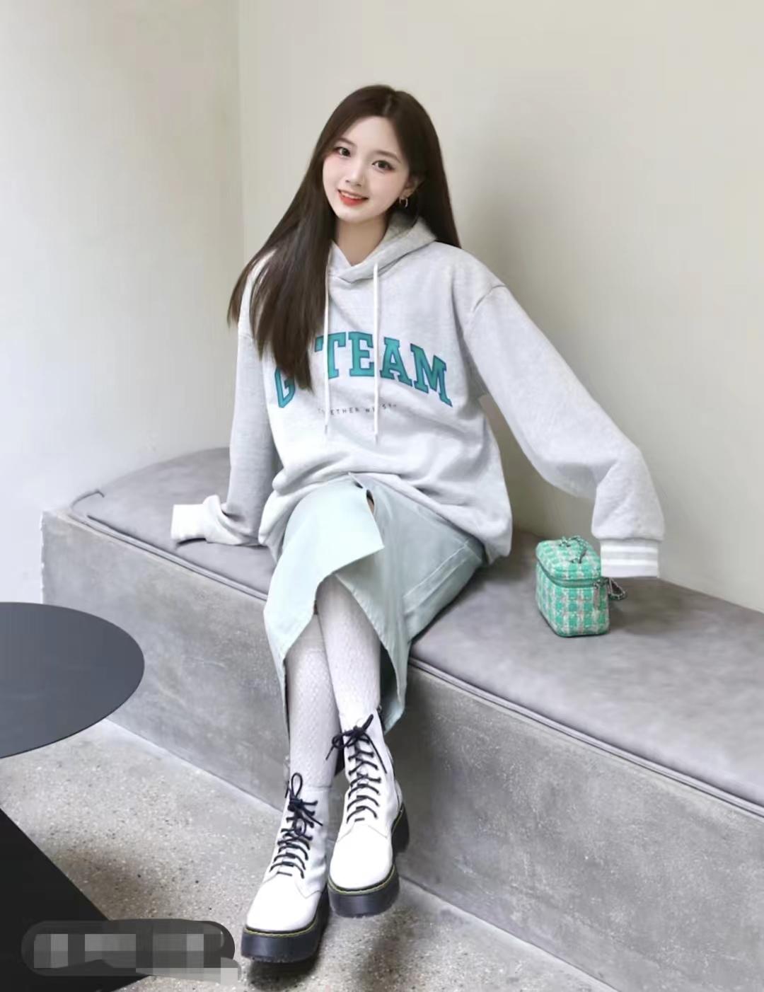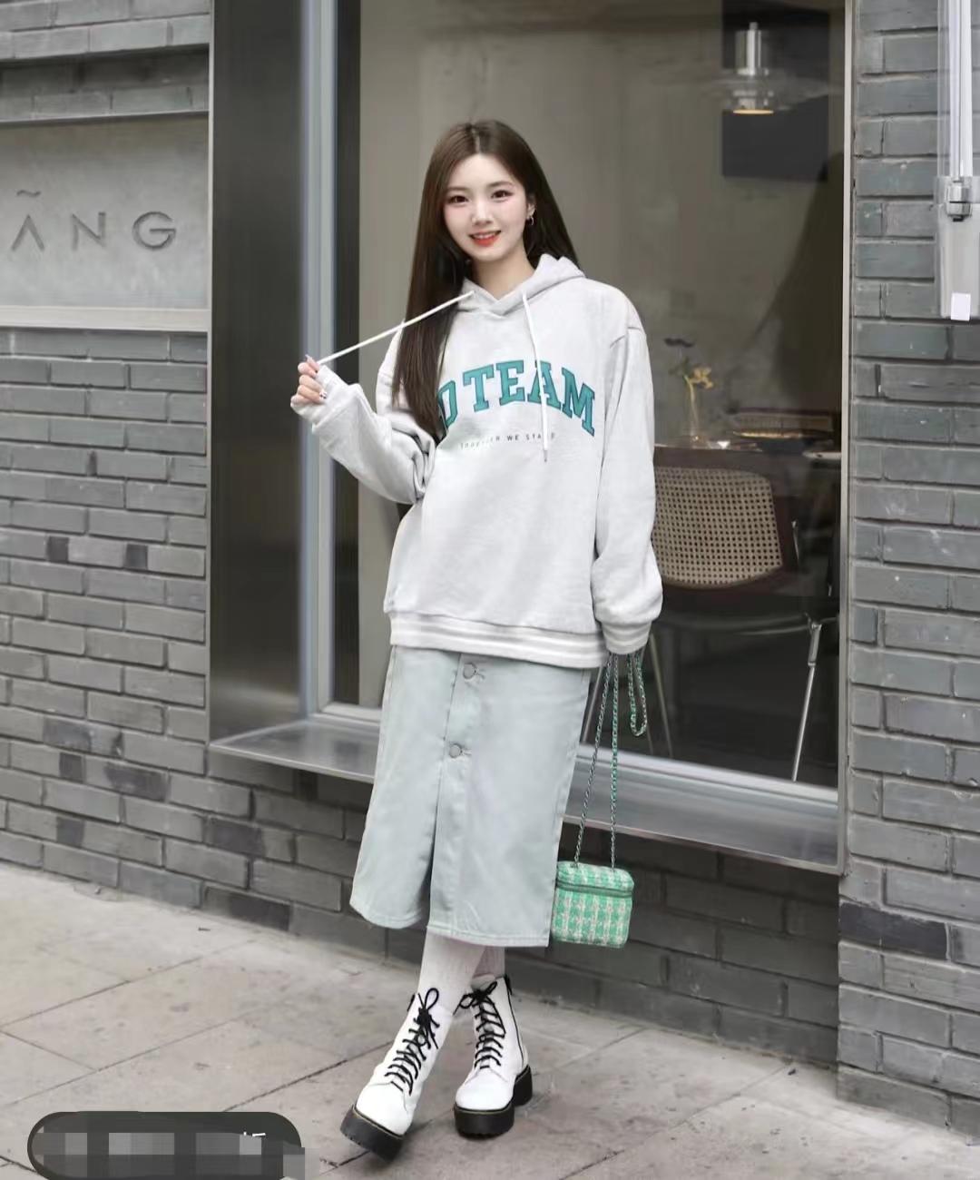 Simple and fresh style: the light gray hooded sweatshirt is white and versatile. The green letters on the chest are embellished. The oversize feeling will look fashionable. The skirt is picked in light green, echoing the green letters on the sweatshirt. , the combination of sweatshirt + skirt makes people feel so good.