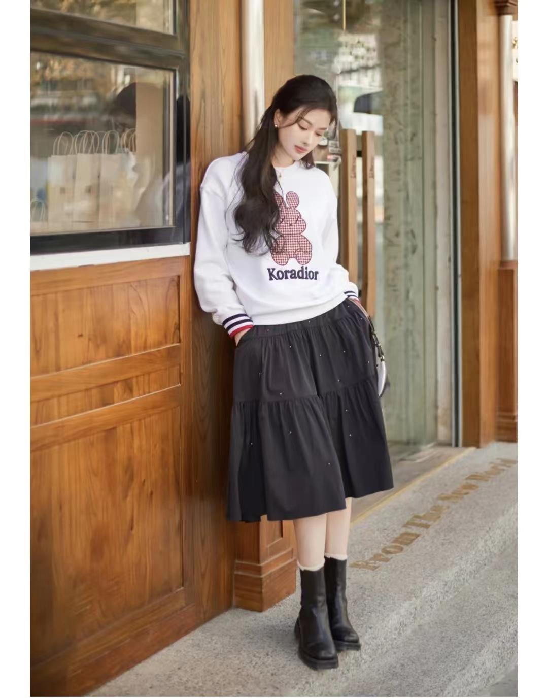 look2 plaid rabbit print sweatshirt + black cake umbrella skirt