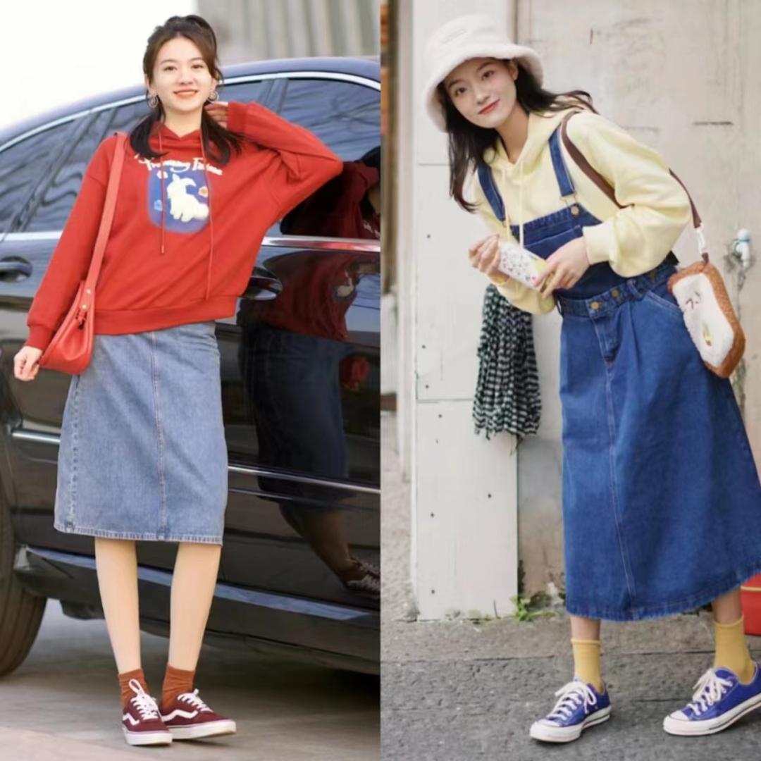 Pairing a sweatshirt with a denim skirt is one of the most popular combinations in spring. The sweatshirt is soft and comfortable, and when paired with a denim skirt, it looks more energetic and youthful, fresh and fashionable. Pairing a sweatshirt with a denim skirt can also better modify your figure.