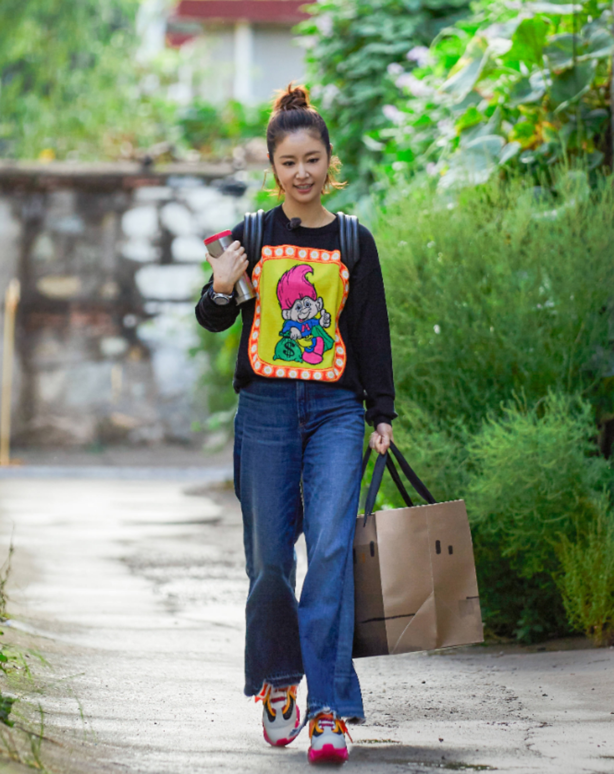 Ruby Lin’s style is less flashy and fancy. She is better at creating a casual style. The sweater style is simple and easy to learn, and she can satisfy the comfort level. It improves the sense of style and is suitable for older women to learn from. For example, her sweatshirt is a basic model. It is very playful with childlike printed patterns. With the little trick of tucking the corners, it can also visually improve the position of the waistline and improve the body proportions.