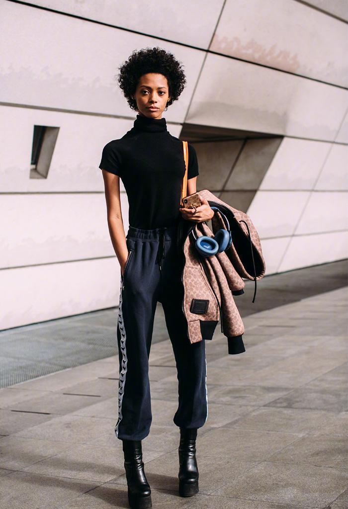 If the color of the sweatpants you are wearing is very If it stands out, you can choose monochromatic clothing with low saturation such as black, white and gray for the top to neutralize the transition, coordinate the light and dark contrast between the top and bottom clothing, and create a visual contrast that is eye-catching but not obtrusive, making the whole look richer. With three-dimensional layering, you can easily create a high-end fashionable look.