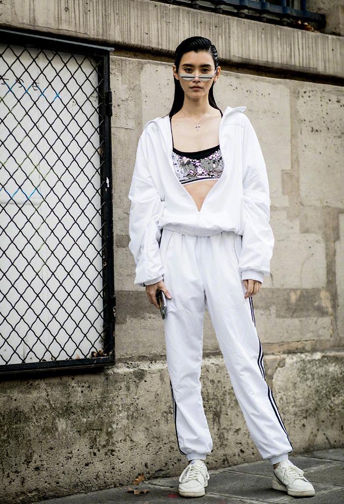 Thin sweatpants will not easily show fat legs. When matching tops, there is no need to deliberately avoid loose styles to coordinate the matching of tops and bottoms. Instead, you can choose to wear a suit directly, which is simple, convenient and practical, and you can’t go wrong. For example, Xi Mengyao chose a suit-style jacket + sweatpants for this look. The combination of a short top and high-waisted sweatpants can highlight the proportions of the figure. Coupled with the eye-catching sequined suspender inner layer, it has a full street feel.