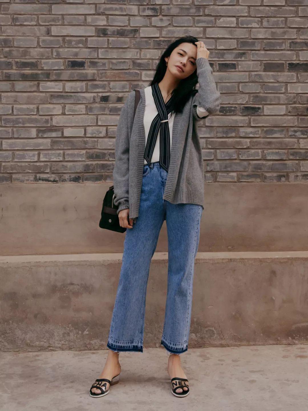 If we talk about the most versatile jeans, they must be straight jeans. Straight jeans have a loose fit and are more tolerant to the body shape. The top is neatly cut and can outline the beauty of smooth lines. It is a must-buy item for every girl. Yao Chen’s look is like this. She wears it with a gray granny shirt, which brings the casual sexiness of straight jeans to the extreme. It is simple but not simple.