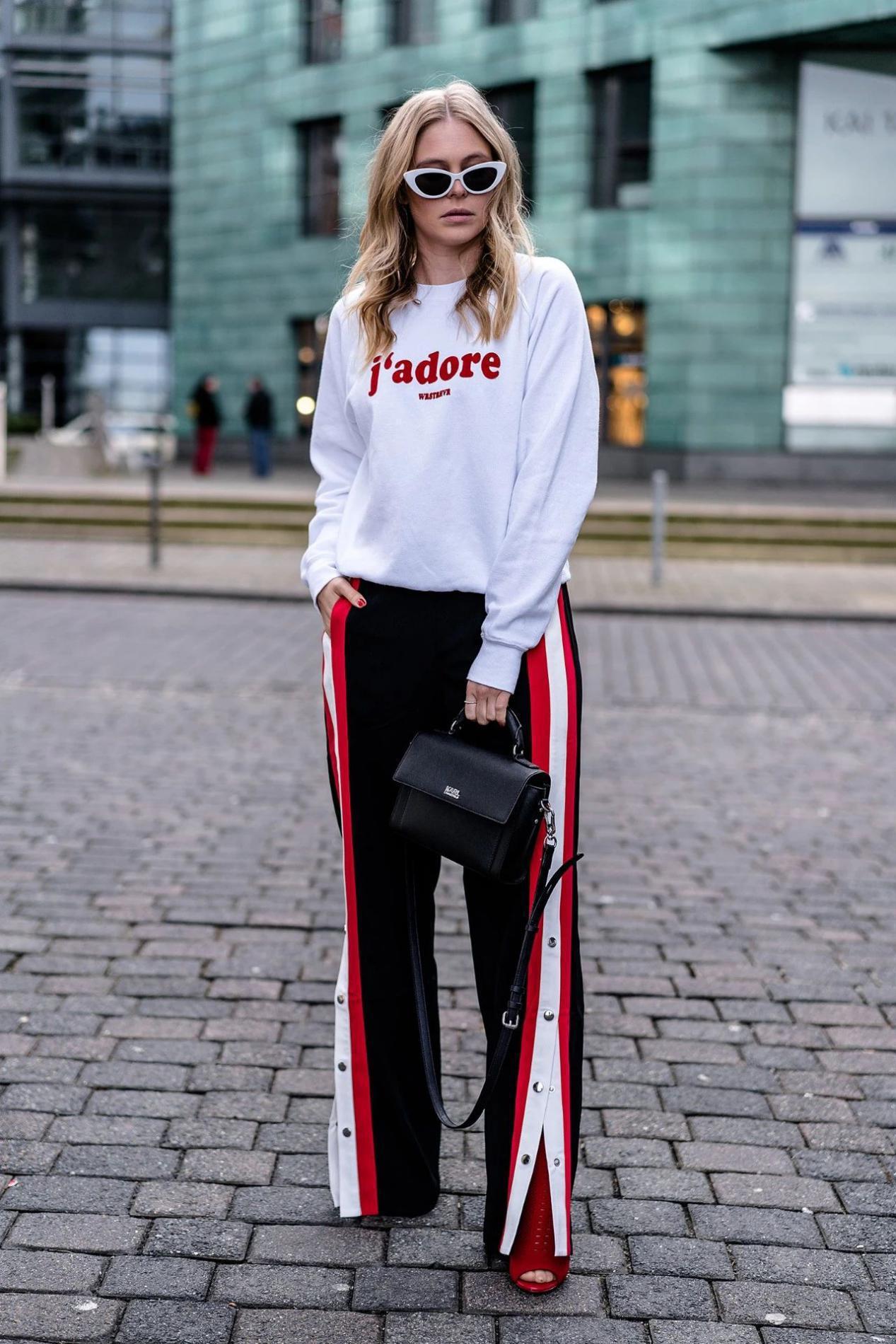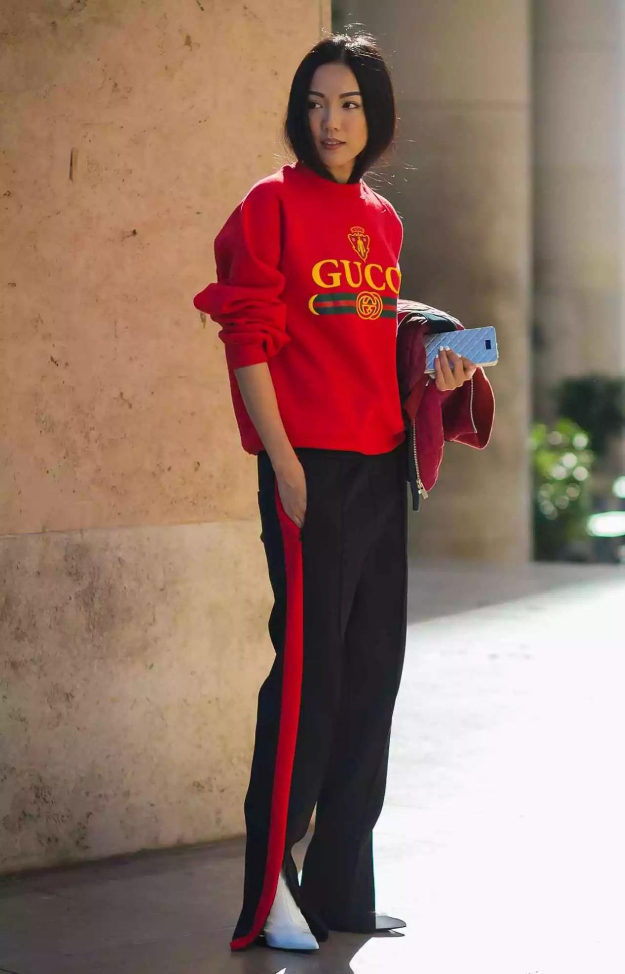 If you want to enhance your fashion sense, it is recommended that you also use the same color matching skills. Wearing the same color can enhance the overall sense of coordination and unity, and avoid Bloated and complicated due to mixed styles. The outfit below is just like this. I chose a red sweatshirt and paired it with red striped sports wide-leg pants. The upper and lower echoes, showing a sense of fashion inadvertently.