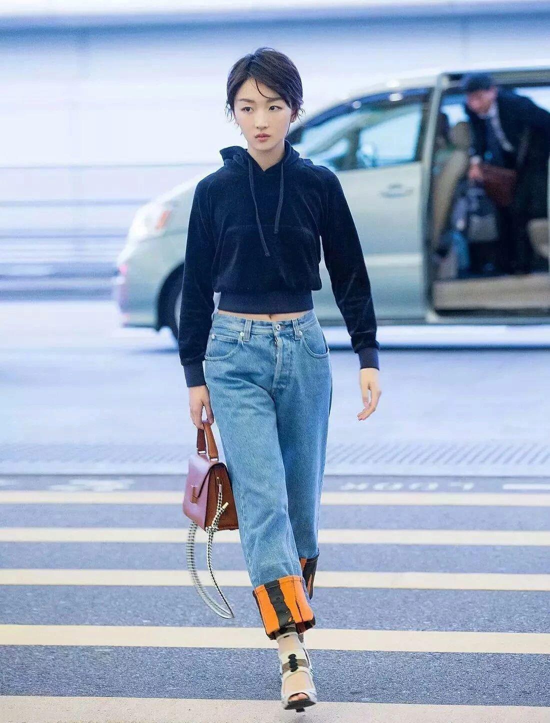 If a petite girl chooses to wear a sweatshirt and denim wide-leg pants, she must shape her waistline, otherwise loose items and loose items The combination of products will lower your height and make your figure look very bloated. Zhou Dongyu used a combination of short sweatshirt and high-waisted denim wide-leg pants, and inadvertently showed off her small waist, further showing her figure advantage. Then step on a pair of high heels to cleverly achieve the purpose of appearing taller and slimmer.
