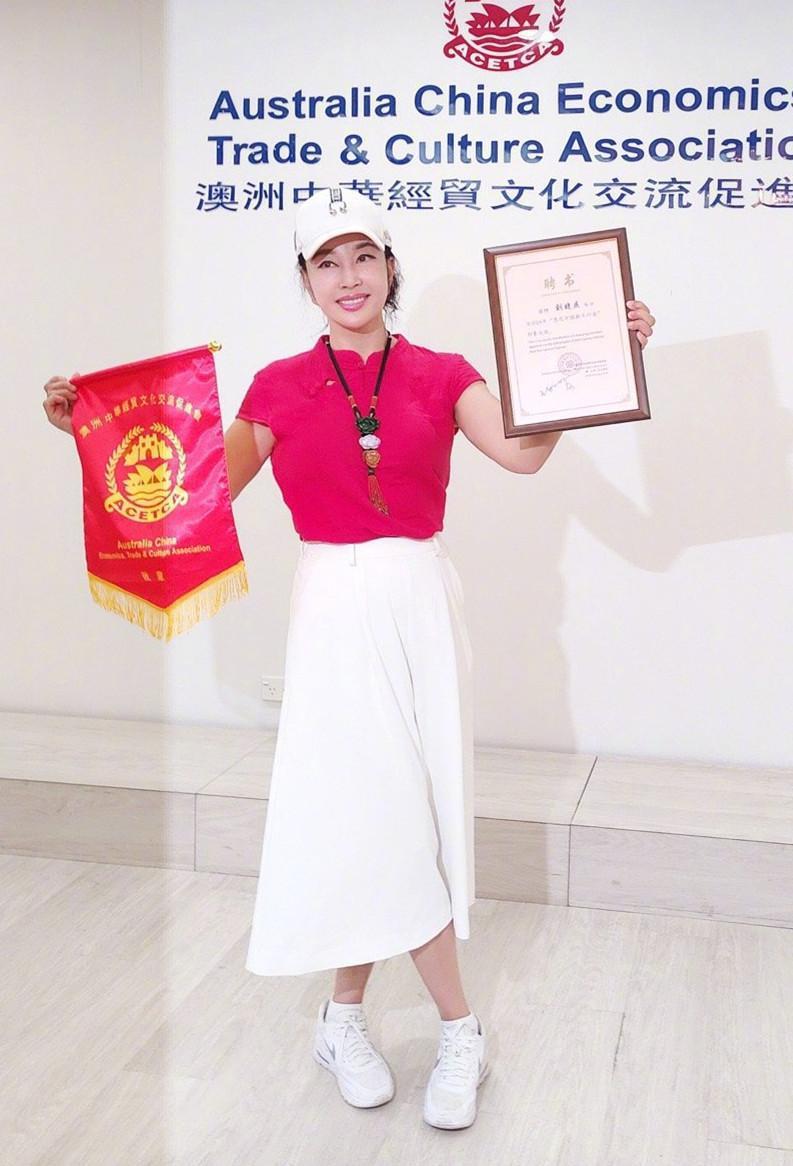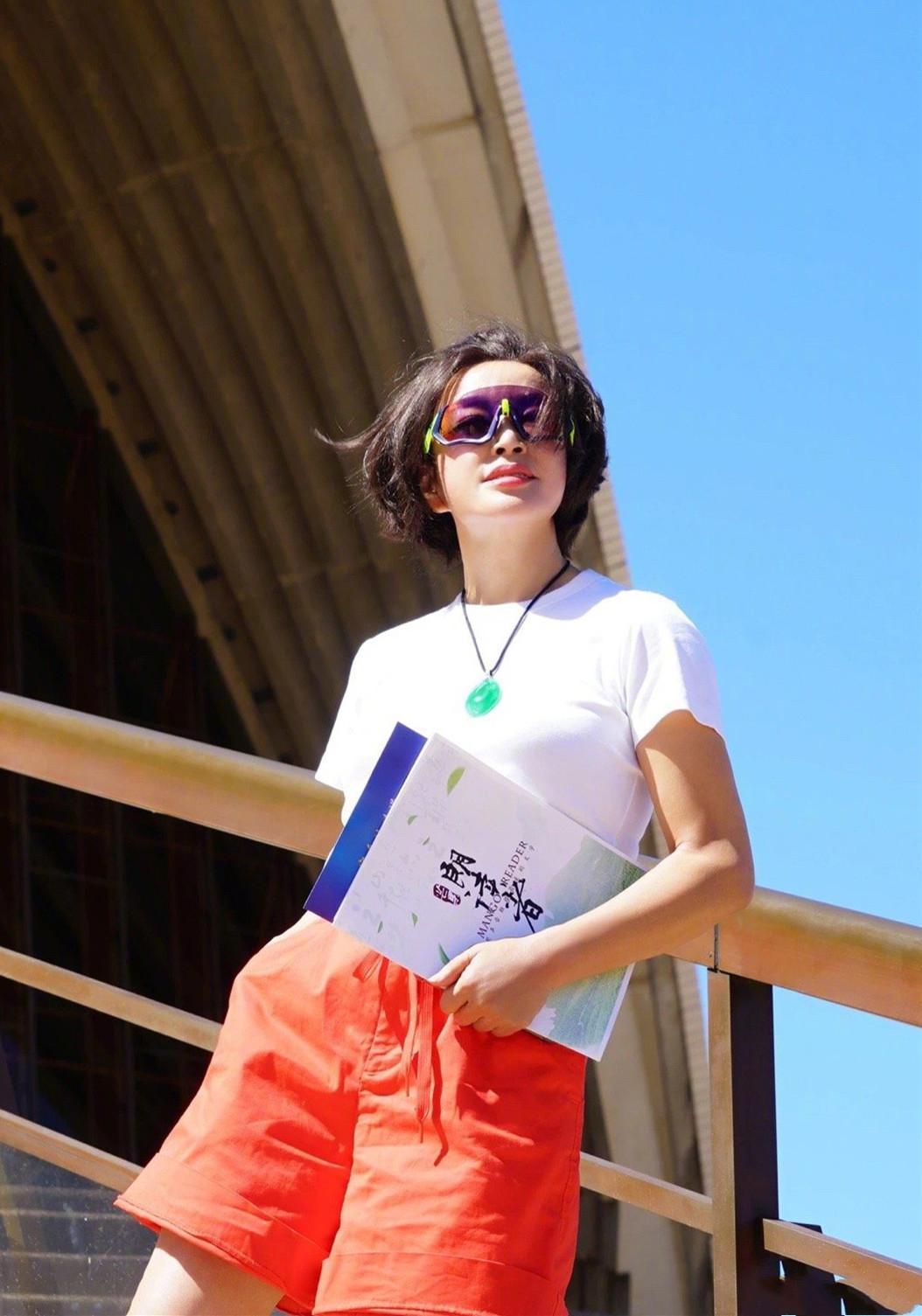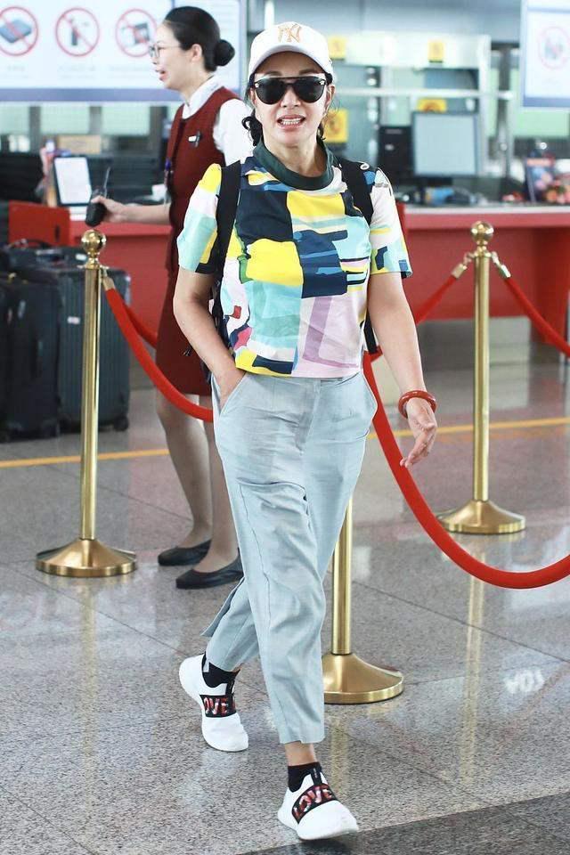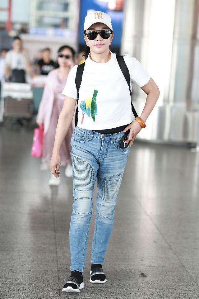 Liu Xiaoqing becomes more and more youthful as she gets older. Dressed in red and white, she is refreshing and eye-catching. She cuts her hair short to the ears and dreams of returning to her girlhood. Compared with pure white T-shirts, bright-colored T-shirts are more eye-catching, but the skin color is still very picky. If the skin color is not fair enough, you should try to choose a style with lower color saturation, which is less strenuous to wear. Not to mention Liu Xiaoqing is still very confident, boldly challenging the bright rose red color, which is very recognizable.