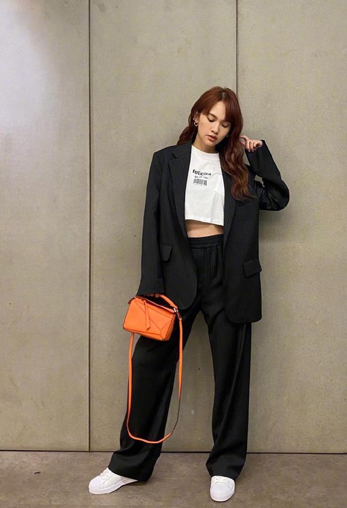 Sisters with a small waist can choose navel-baring T-shirts that can better highlight the advantages of the figure. They are more personalized and stylish than ordinary T-shirts, and can also enhance the entire look by exposing the skin appropriately. The sexy index allows people to shift their attention to the waist and abdomen, showing off a good figure easily. Rainie Yang knows how to make use of her figure. When wearing a suit, she wears a navel-baring T-shirt underneath, and even wears it with high-waisted suit trousers. Instantly elongates the proportions of the lower body, making the legs look slimmer and longer, and the whole look is so sassy.