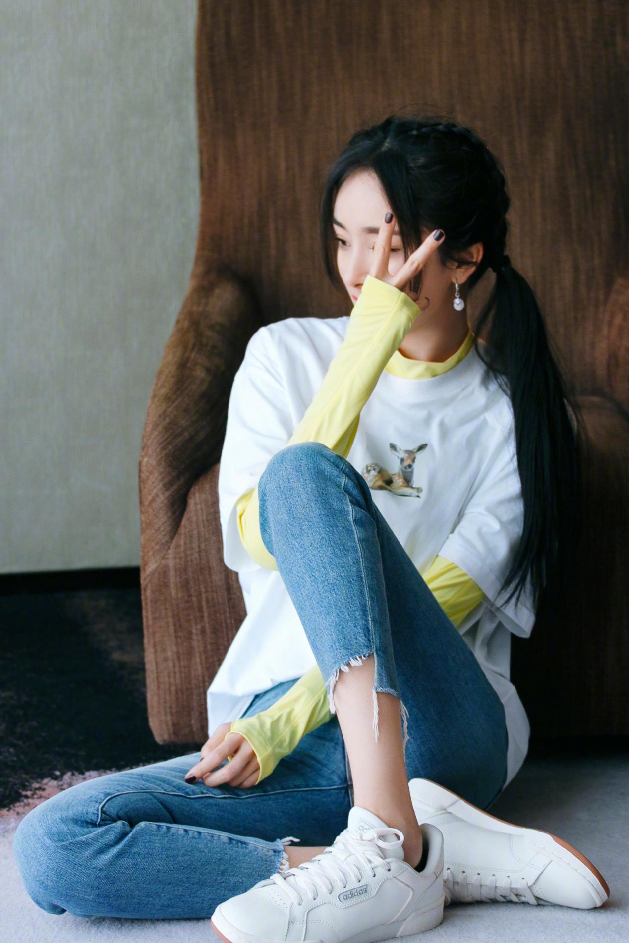 Stacking is the most common method of dressing during the change of seasons. It not only solves the problem of monotonous styling, but also brings complementary effects, improving certain The utilization of basic styles makes girls’ wardrobes neater and more orderly. In fact, summer T-shirts can also be layered to create more exciting looks. This kind of dressing often appears in Yang Mi’s looks. This way, this look is a good example. The white T-shirt and light yellow inner layer are fresh and lively. The double ponytails are youthful and playful. At the age of 33, she looks like she is 18 years old.