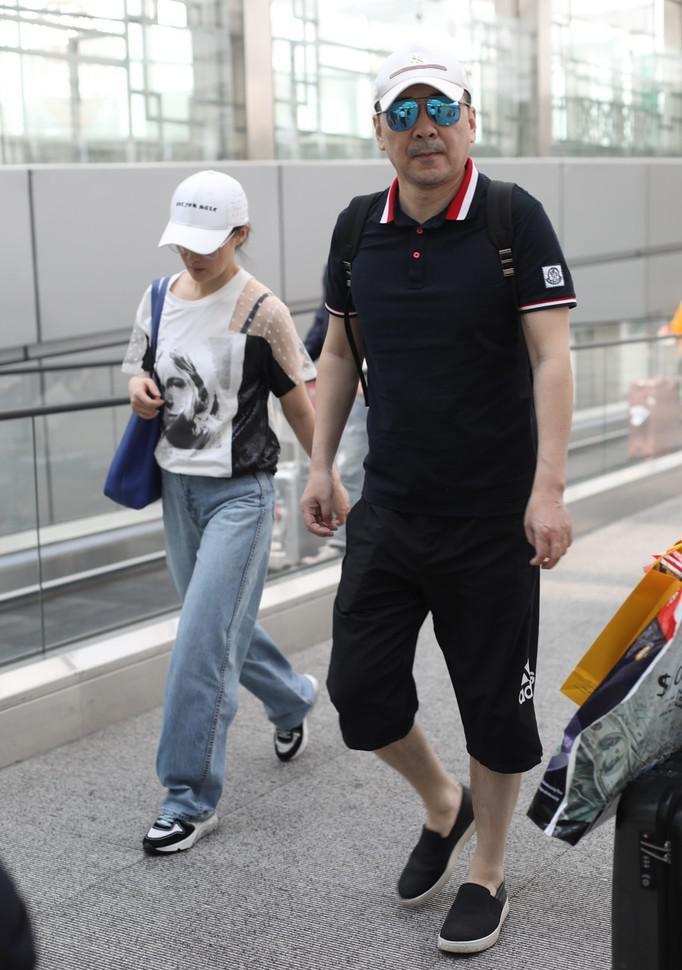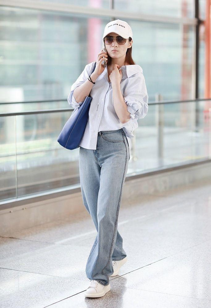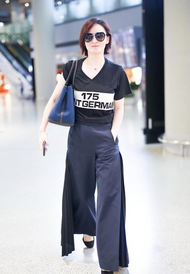 Jeans are a classic style of trousers. They come in thick or thin fabrics and can be used all year round. They are a great choice for middle-aged women. The age effect is very good, and the available styles of jeans are very rich, such as straight-leg styles and wide-leg styles, which have a good effect on modifying the leg shape. No matter how thick the legs are, they can be perfectly hidden. Choosing dark styles will have a more significant slimming effect. Jiang Qinqin wore black straight-leg jeans when walking to the airport this time. The nine-point length that exposed her ankles made her look slimmer and taller. The pairing with sneakers was full of vitality. The classic black + white color scheme was simple and elegant.