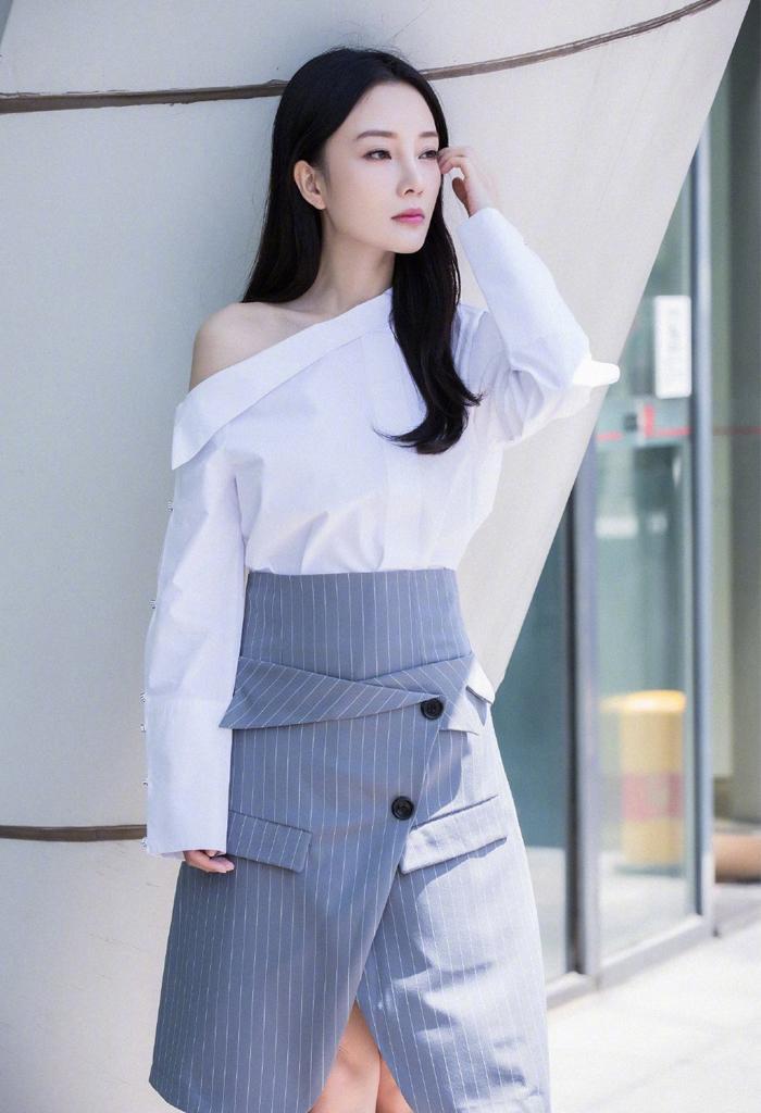 There are also trendy styles in white shirts. The slanted shoulder white shirt is one of them. Its style breaks through the small lapel design of traditional shirts and adopts The neckline cut with sloping shoulders has an asymmetrical contrasting beauty. It can also show off the collarbone and shoulder line on one side, thereby elongating the neck line and adding a bit of sexy charm to the look. The white shirt Li Xiaolu is wearing is a slant-shoulder shirt. The loose version adds a lazy tone. Paired with a high-waisted striped skirt that also has a sense of design, a chic commuting look is completed.