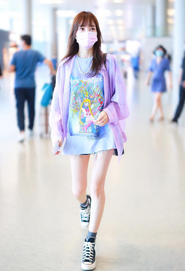 If you want to talk about the popular colors in 2020, purple must be indispensable, especially taro purple and lavender purple. The color saturation is not high and the brightness is reduced. The brightness of the tone is a bit more “matte” than deep purple and bright purple. It is gentle and romantic, but also has a sweet and dreamy color. It shows whiteness and temperament, and can hold even yellow and black skin. Li Xiaolu wore a taro purple shirt for her airport look this time, paired with a cartoon-printed T-shirt. The whole look was eye-catching and girlish, making the 38-year-old look like an 18-year-old.