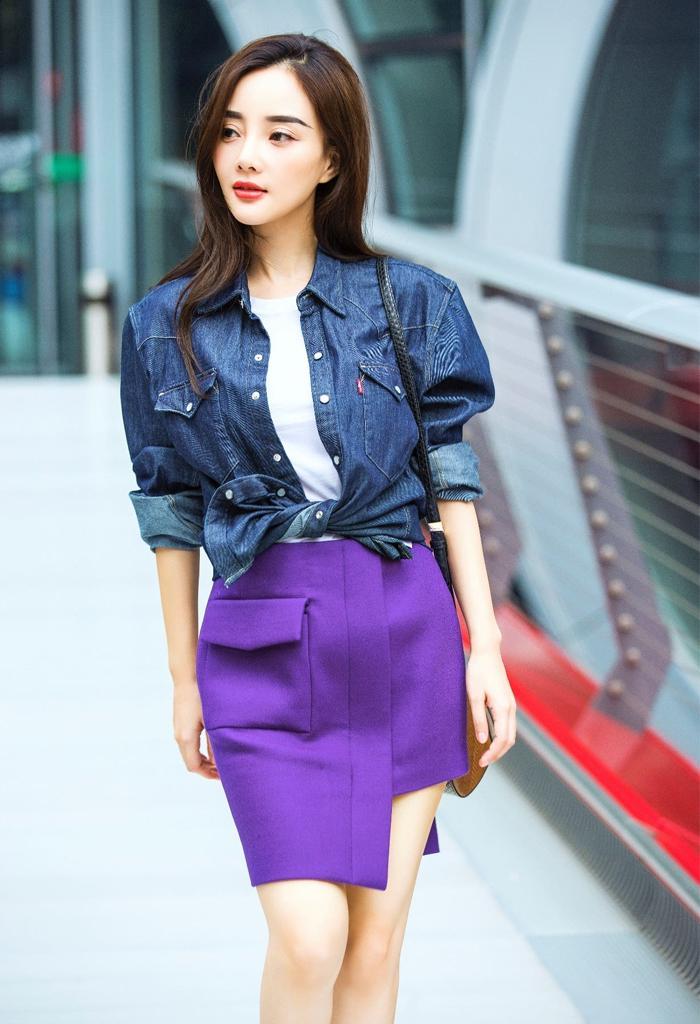 If you prefer a casual street style, you can try a denim shirt. The combination of stiff denim fabric and three-dimensional shirt pattern can bring a comfortable and stylish upper body effect. Even if it is a very ordinary style, denim fabric can be used to inject a bit of street feel into the item. For example, Li Xiaolu wore a denim shirt this time. The knotted hem is more stylish and stylish, and it can also tighten the waist and highlight the waistline.