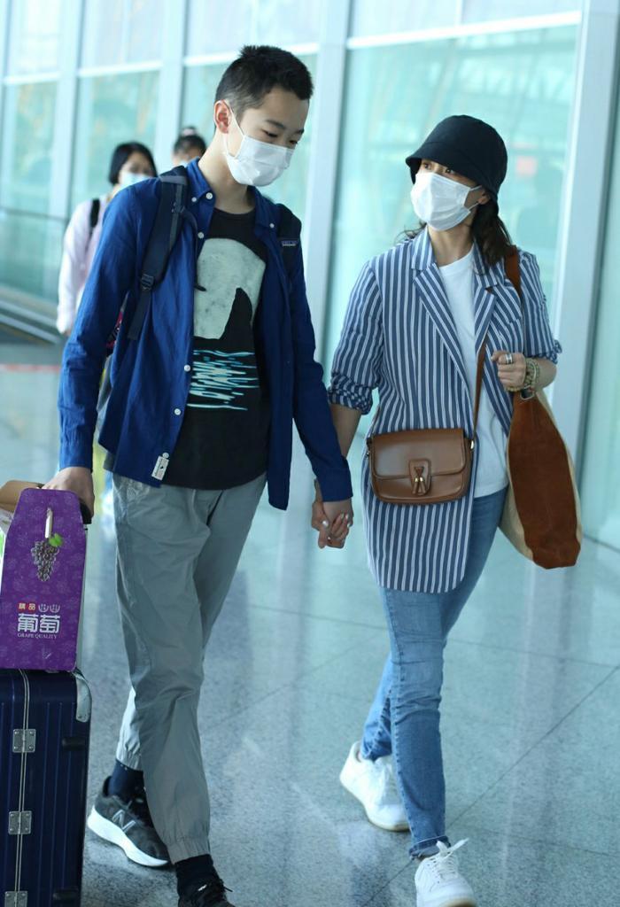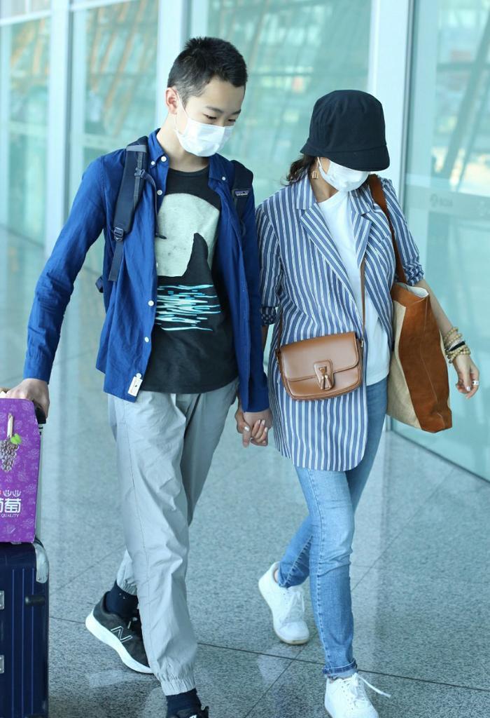 Hai Qing walked to the airport with her son, wearing a suit and white T-shirt casually and fashionably. The 14-year-old son is taller than his mother. If you want to wear a suit in your own style, you can learn from Haiqing’s experience in suit dressing, choose some special styles, or use matching to increase the fashion sense of the look.