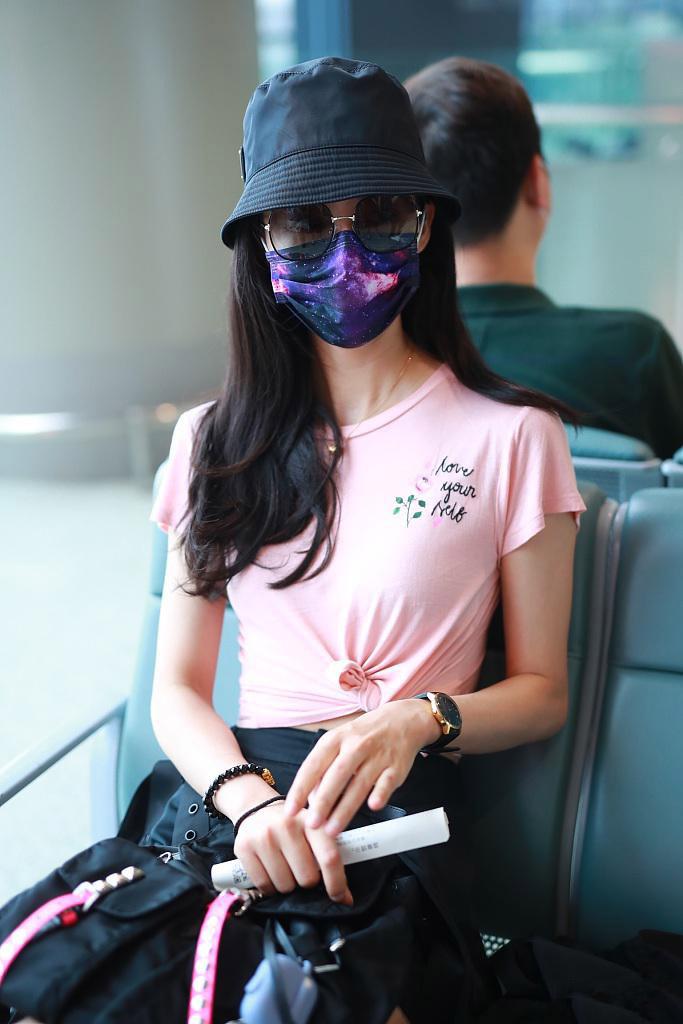The color and design of a T-shirt will affect the formation of its style attributes. Dark-colored T-shirts look thin and cover the flesh but appear dull, while light-colored T-shirts are fresh, natural and easy to use. To make you look fatter, bright-colored T-shirts are more lively and recognizable. Secondly, adding different fashion elements for embellishment can show alternative fashion charm. Printing elements are unique and individual, which can break the monotony of the style and improve the overall sense of fashion. They are favored by fashionistas. , the pink T-shirt worn by Han Xue has some printed elements added to it. It is fresh, sweet and girly. It has an excellent age-reducing effect. The fabric is soft and waxy and feels comfortable against the skin.