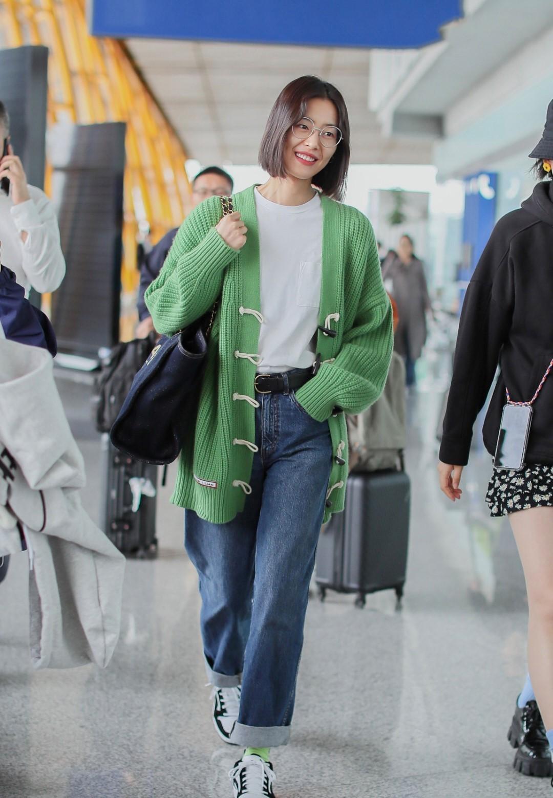 The denim jacket is very wide due to the fabric, and it can modify the body line very well, but the fabric that is too stiff can also easily cause a sense of restraint. If the fit is slightly slimmer, it will be too tight. This is an inevitable problem with denim jackets. If you want to wear it more relaxedly, a knitted jacket would be a good choice. It is soft, elastic and does not abrade the skin. Among them, the fine stitch style It has a better slimming effect and is also the most popular design among knitted sweaters. Liu Wen wears a white T-shirt with a knitted cardigan that is gentle and intellectual. The grass green color is fresh and naturally whitening the skin.