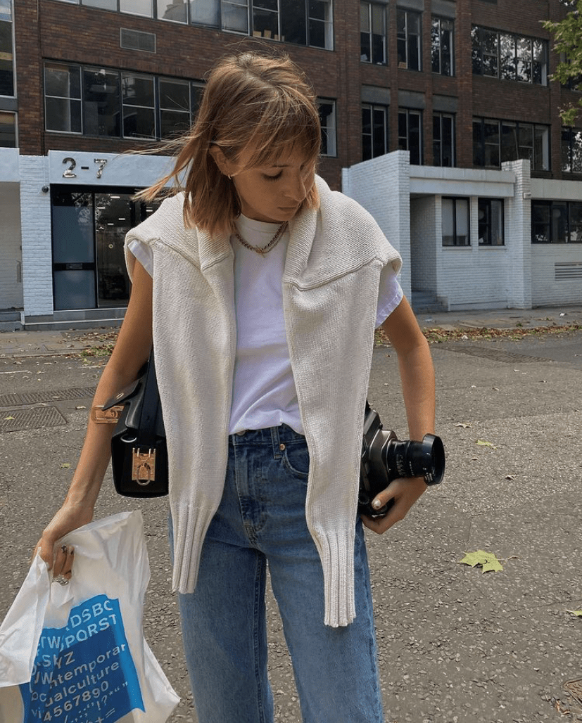 Choose the most basic pure white T-shirt to match. You must know how to enrich the overall sense of layering, so as to avoid the ordinary passerby feeling and enhance your fashion. For example, a pure white T-shirt paired with jeans is a bit too ordinary for the general public. You can choose to wear a shawl casually on the shoulders to create a casual and lazy style, allowing you to reveal a high-end feel inadvertently. The taste will also be very charming.