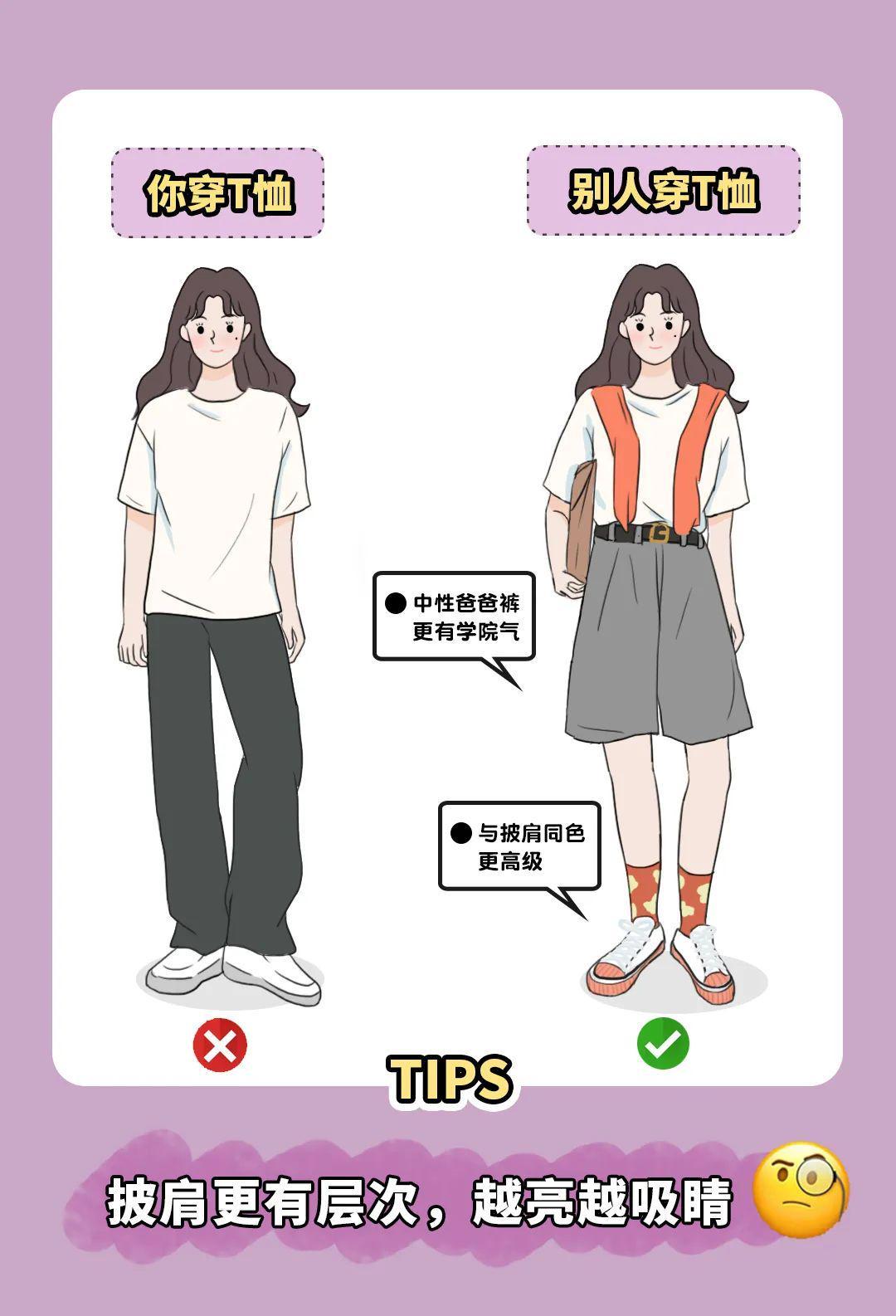 Nowadays, more and more fashion bloggers, when sharing the outfits of T-shirts, will not miss the way to wear them with shawls. In fact, it has many magical features. One is that it enriches the overall layering, and the other is that it can create a lazy and comfortable casual style! As shown in the picture above, you can clearly see the difference, and people will sincerely praise you for your ability to wear it!