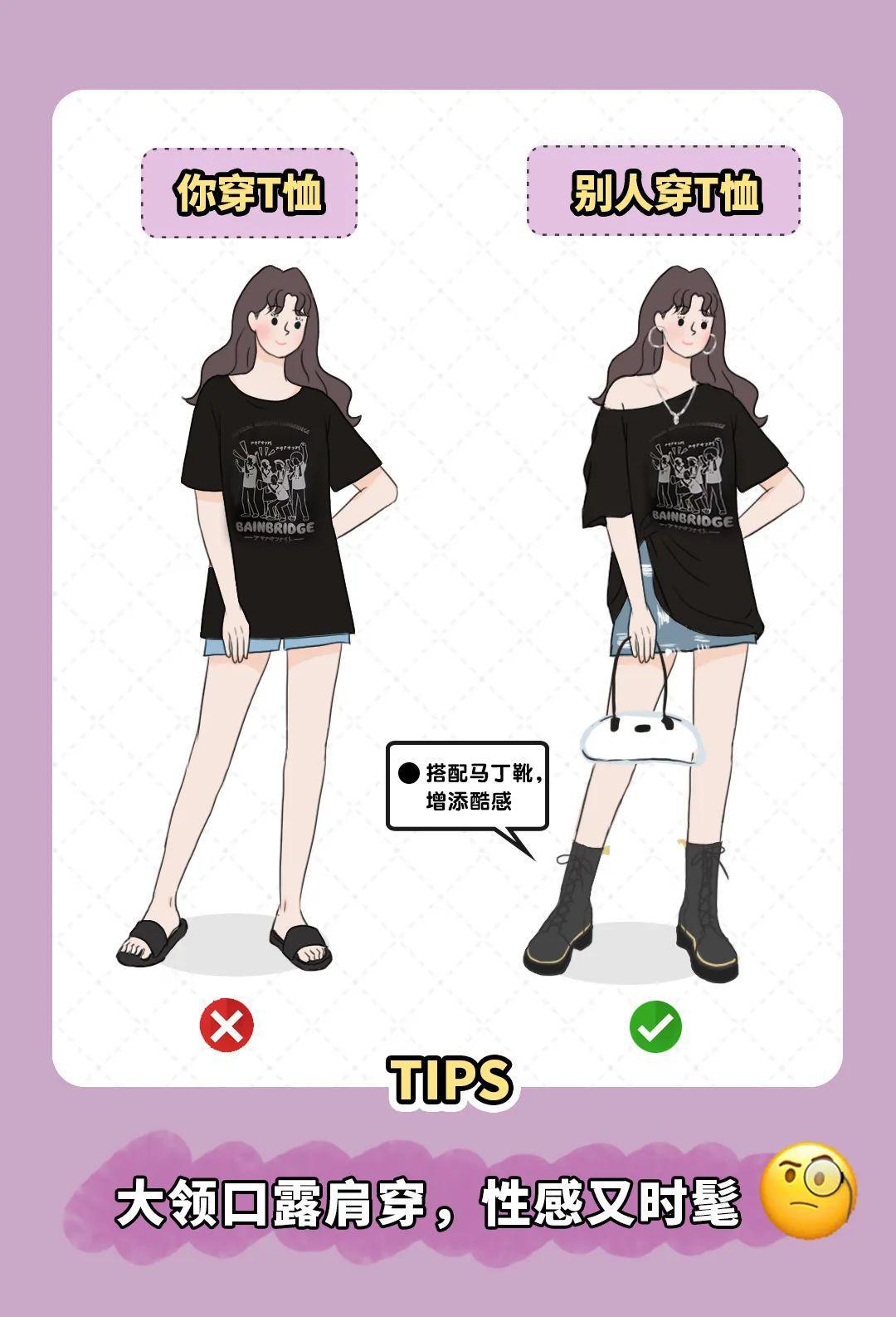Many girls choose to buy T-shirts with large necklines in order to make them easier to put on and take off. In summer, they wear clothes with larger necklines. , is also cool and breathable, and will make you look slimmer. This is true, but you can’t wear it according to normal thinking, otherwise it will easily look sloppy and make you gain weight! You can choose to pull down one shoulder to create an off-shoulder effect. Show off your sexy charm and easily win a big step!