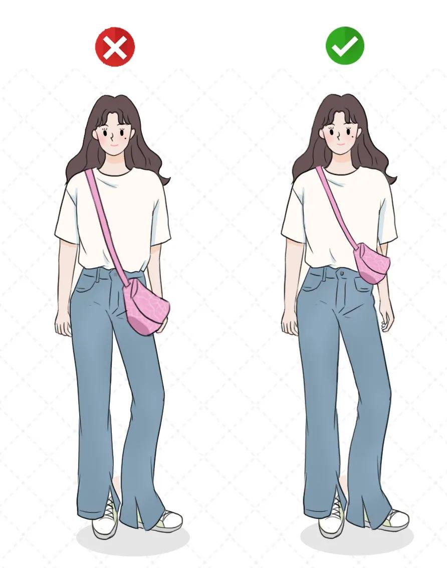 There are no big taboos in the actual operation of this method, but you should remember two points when choosing a bag! Try to match it with an exquisite small bag, and shorten the shoulder straps. This can virtually increase your center of gravity, and naturally you don’t have to worry about not looking good.