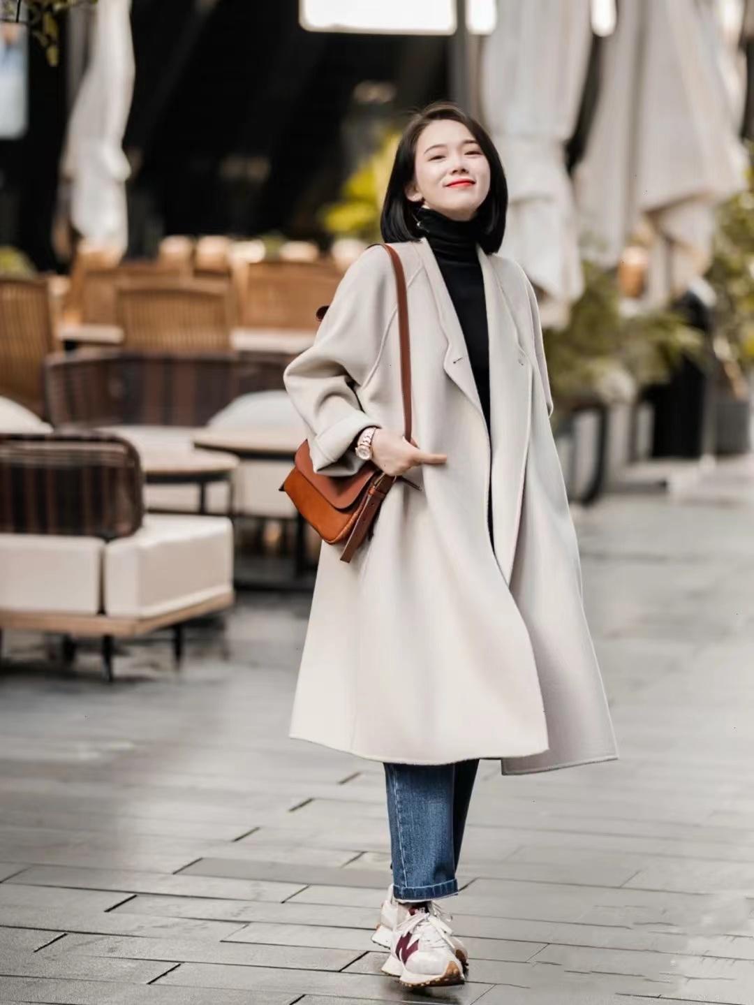The slightly looser cocoon-shaped coat is most suitable for people who are not picky. Whether you are a young girl or a middle-aged woman, you can try this style. Wearing a simple black dress as the inner layer highlights the high-end beauty. Combined with a tassel scarf of the same color, it has a strong sense of fashion. Wearing a double-breasted suit jacket is also handsome, sophisticated and very aura.