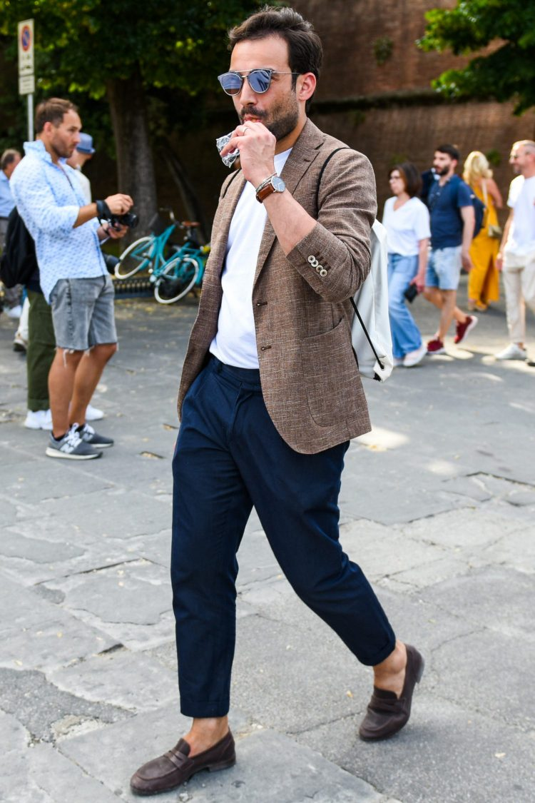 A light coffee suit paired with a white T and navy blue nine-point trousers has a very calm and elegant look. This combination will not look very serious and will give people an easy-going attitude. Add a pair of brown suede loafers. shoes, the overall shape is full of elegance.