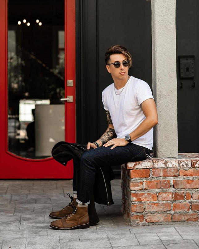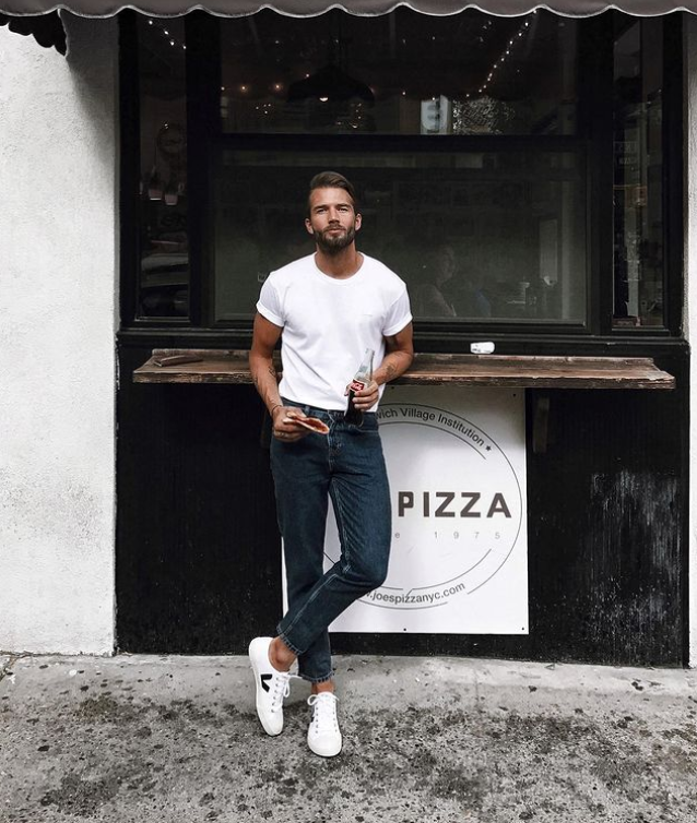 Normally, men don’t choose trousers that are too slim to avoid being too tight and causing a greasy feeling. However, a white T-shirt paired with dark denim can highlight the muscle curves without being too exaggerated, giving it a tough-guy look. White T’s title of “greasy removal expert” is well deserved!