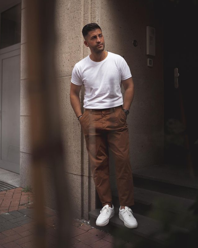 Add some unique design to the white T-shirt to show your personality. Rolling up the cuffs or adding pockets of the same color are good ways to add a sense of layering. It is low-key and unobtrusive, and it is Invisibly more special.