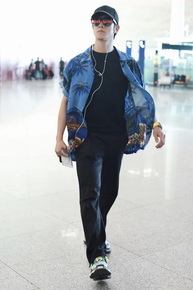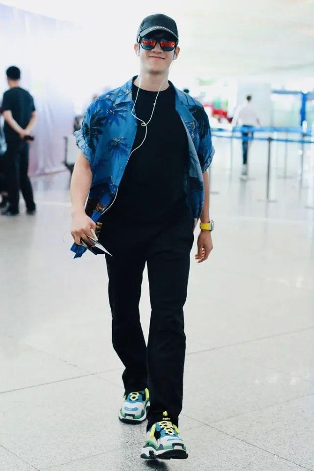 Pair a black T-shirt with black casual trousers, and the overall look will look very good. If you think the black tone looks dull, then pair it with a light Hawaiian shirt, so that the look will be rich and eye-catching. Moreover, in Li Zhiting’s style, the color of the shoes echoes the color of the shirt, which makes the style more fashionable.