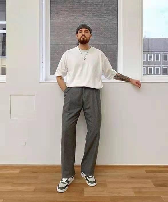 In men’s matching, the looser the fit, the more tolerant it is to the body shape. If you have small flaws in your figure, such as a small belly or uneven curves, you might as well try to use loose fit overalls. Version. A wide T-shirt paired with straight suit trousers makes the figure look quite well-proportioned, while the casual curves look chic and full of cool street style.