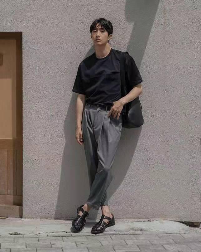 If you want to be restrained and low-key, you can choose a more “solid” cotton T-shirt paired with tapered suit pants. Pure cotton T-shirts are full of thickness, which greatly softens a person’s aura, while tapered suit pants often add pleats to the waist. Although the legs are modified without causing tightness in the buttocks, they still look simple and elegant.