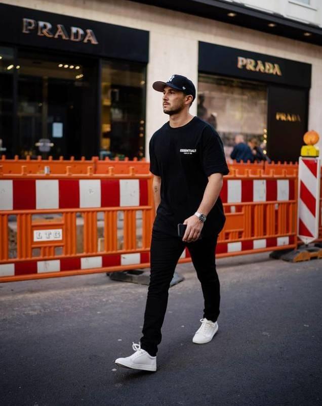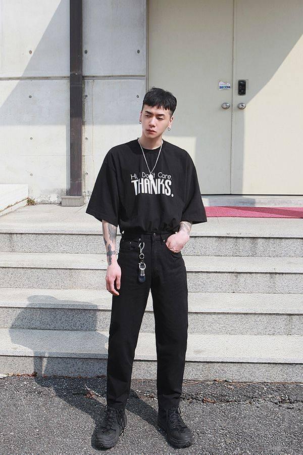The simplest color combination is undoubtedly a solid color. A pure black T-shirt paired with trousers of the same color directly makes the layered tops and bottoms smooth and natural without any sense of fragmentation. This color scheme is also the most popular worry-free match among men. If you want to wear it well, you must remember to add some bright details to avoid the hollowness of a single color scheme. Letter designs or white shoes are both good options. choose.
