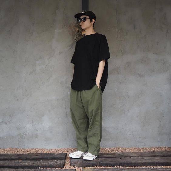 If you want to choose a pair of trousers and a black T-shirt that are ageless and fashionable, military green is definitely your first choice. The green color is eye-catching and white, while the military green color adds a bit of calmness. Paired with a black T-shirt, the look can be just right.