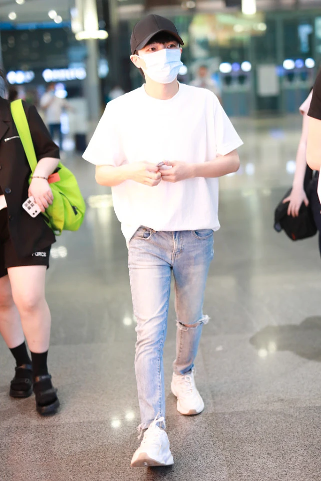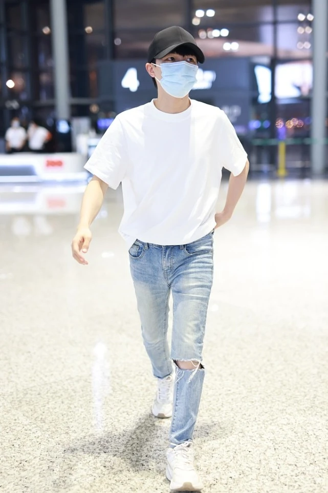 If the upper and lower garments are designed in light solid colors, it will inevitably be monotonous. Adding details can greatly alleviate the hollowness and make the matching more design-like. Zhou Shen added a hole design to the trousers to greatly increase the sense of fashion. The torn holes add to his personality. It matches the oversize T-shirt and makes him look very masculine!