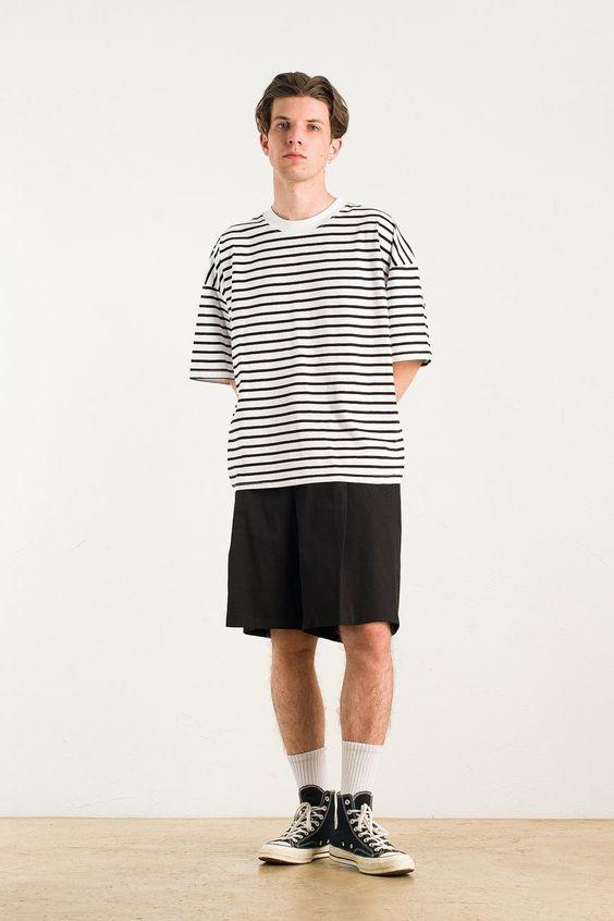 If you don’t want to look casual when wearing shorts when going out, first of all, the colors you choose should be simpler, and secondly, keep the tone unified. You can match it according to the color of the stripes The corresponding trousers, for example, a black and white striped T-shirt like this paired with a pair of pure black shorts are just right, and the overall look is very coordinated.