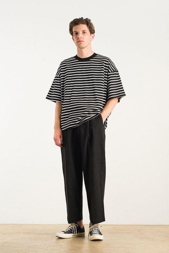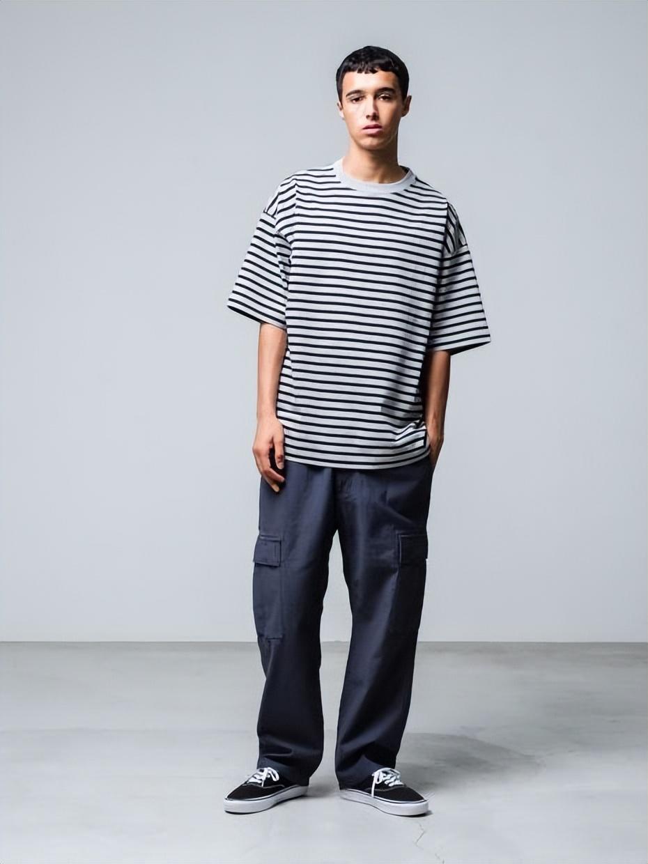 There are always men who are worried that if they choose a loose fit, the shape will appear fat and procrastinating. But in fact, you don’t have to worry about this. You can increase the sense of line by inserting inner stuffing, which can make the loose fit more comfortable. Striped T-shirts are used to the extreme and can highlight the proportions and waistline.
