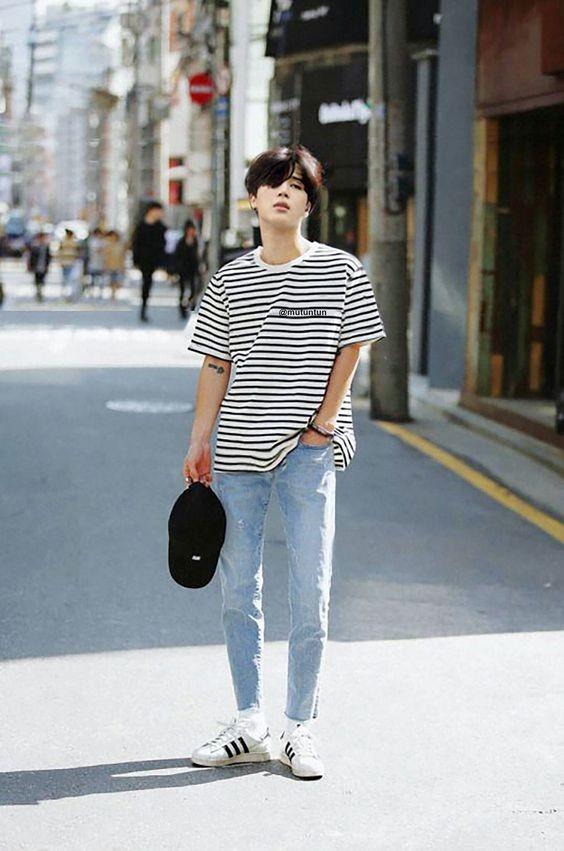 Jeans are a must-have for trendy men. Pair them with a loose striped T-shirt, which can just make up for the shortcomings of jeans. Blue jeans tend to make the upper body look fatter, so pairing them with a longer and wider striped T-shirt not only covers the lower body well, but also allows for freedom of styling, making it casual, simple and low-key.