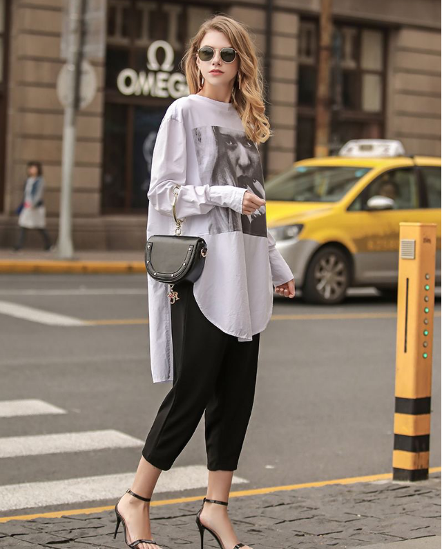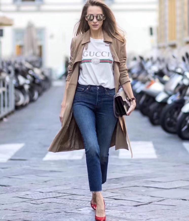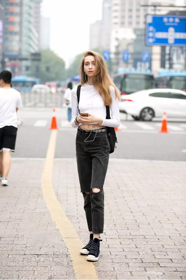 In addition to large prints, you can also choose a simpler style. For example, the lettered T-shirt that everyone is familiar with looks great on the European and American girl below. The printed T-shirt is paired with high-waisted jeans, which outlines her figure well. It is clean, comfortable and not cumbersome. The classic black and white color scheme is also more elegant. Watchable.