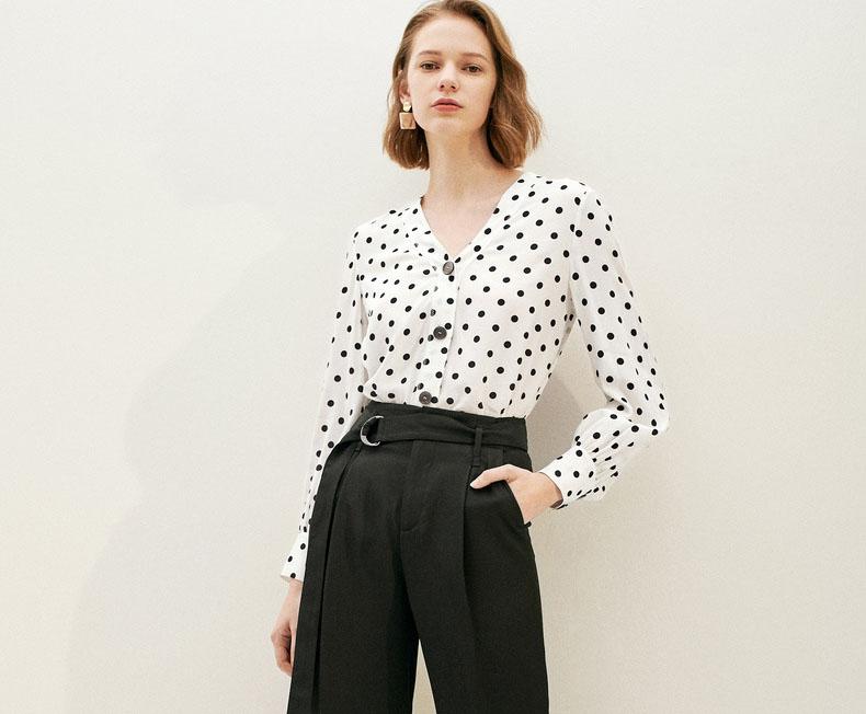 Contrast color polka dot jacquard gives people a romantic and sweet natural atmosphere. Against the backdrop of the romantic polka dots, this chiffon white t-shirt A more eye-catching focus. The smooth lining is soft against the skin, loose, elegant and extremely handsome.