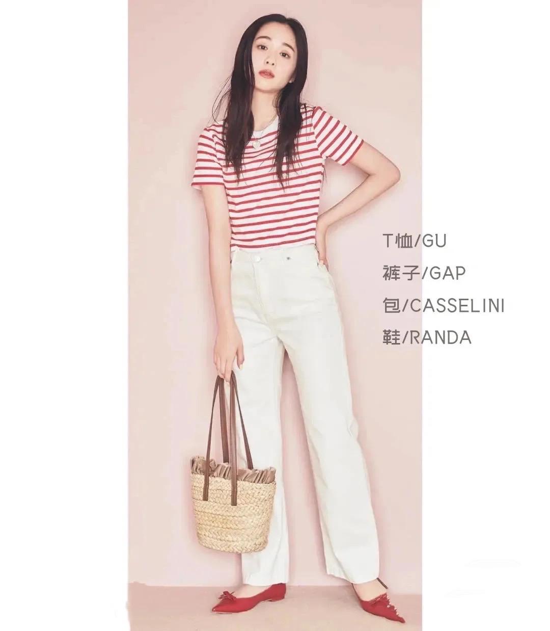 Striped T-shirt is a classic element. The intertwined stripes of red and white are visually more refreshing and bright, and the color combination is also more gentle and generous. Such a striped T-shirt, paired withWhite straight-leg pants with a waistband give people a strong and neat look.
