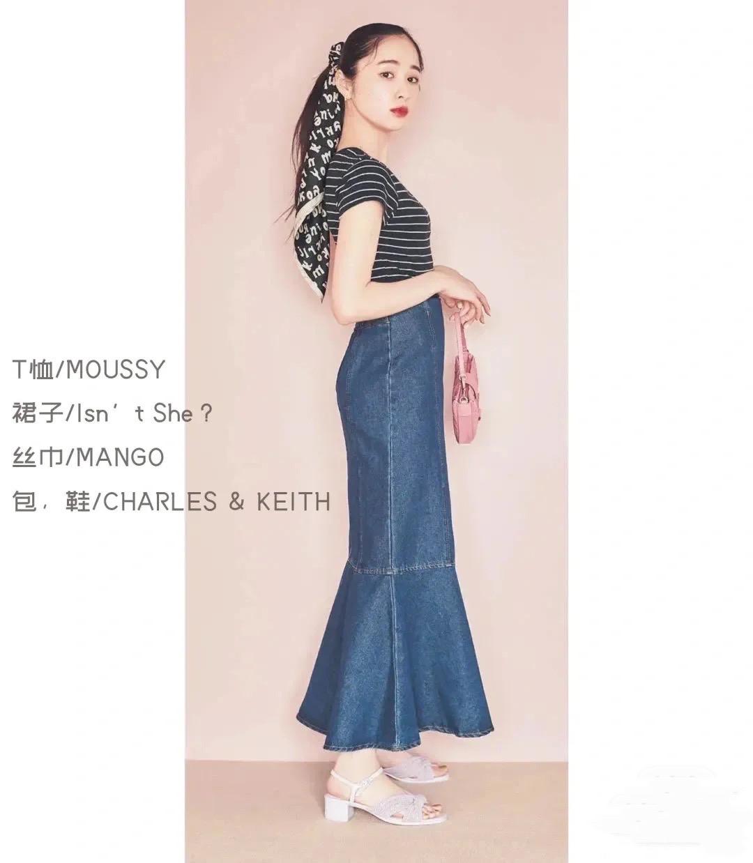 A slim-fitting black and white striped T-shirt, which can be paired with a high-waisted denim skirt. The cut of the denim skirt is more slim, and the style of the fishtail skirt is chosen. The overall style is elegant and generous, especially refreshing and fashionable.