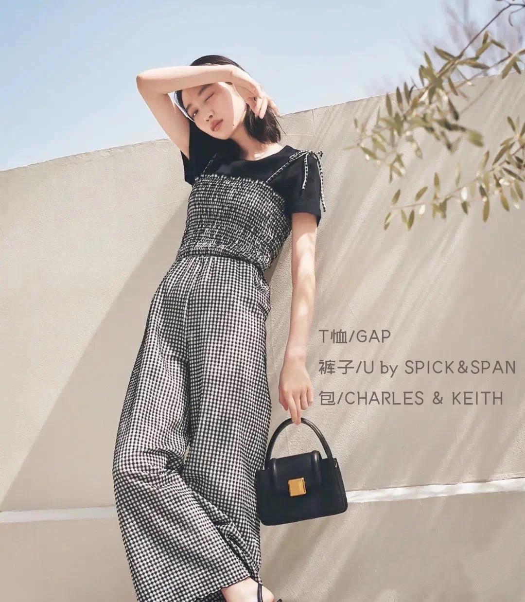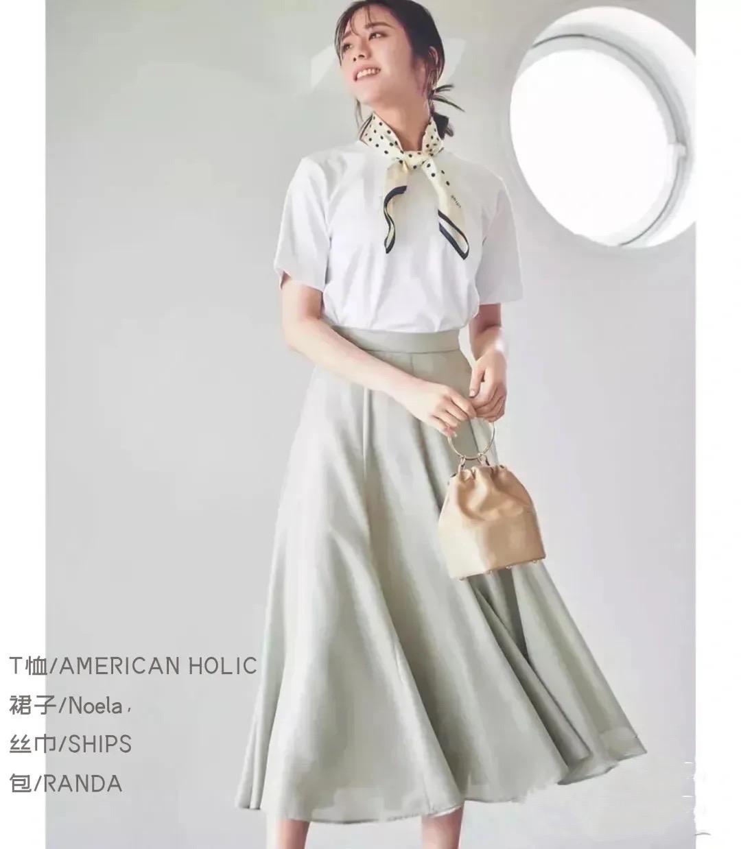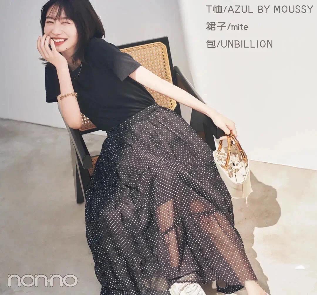 A black T-shirt has a certain visual compression effect, and a slightly looser version will make it more visible. Be thinner. Paired with a high-waisted polka-dot skirt, it gives a particularly gentle and refreshing aesthetic.