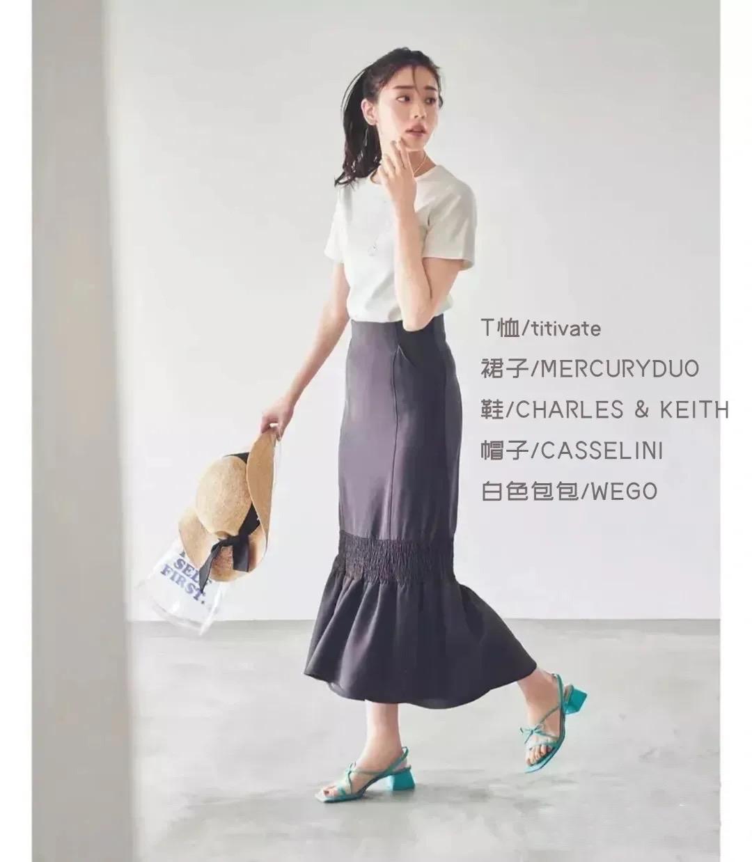 When pairing a refreshing white T-shirt with a fishtail skirt, you can pay enough attention to the waistline. The high-waisted fishtail skirt can optimize the body proportions and visually present a sense of long legs. The sandals with formula heels are also very fashionable and generous.