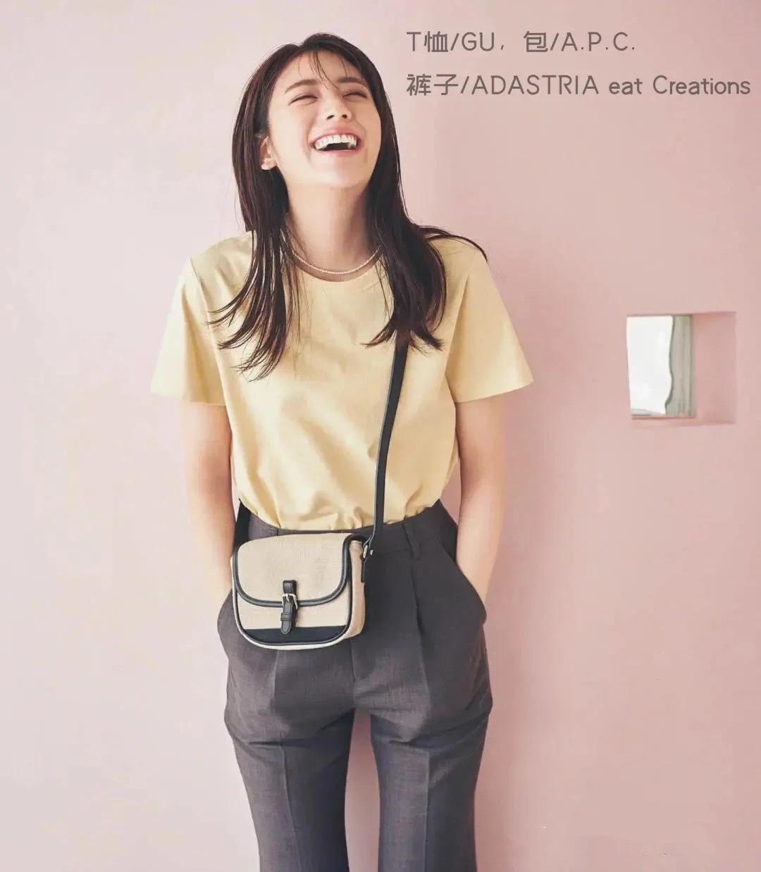 Goose yellow T-shirt can also weaken the sense of age to a certain extent. Pair it with high-waisted tapered pants for a refreshing and neat look. The simple and low-key outfit also gives people a particularly high-end and simple atmosphere.