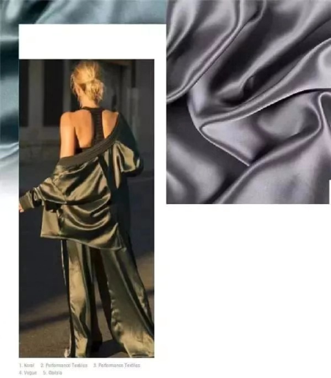 The popularity of satin fabrics on the show continues to rise. The smooth fabric effect is very comfortable. Fabric blended from silk, cupro and rayon to create a draping effect in women’s clothing. The sateen weave has a glossy effect; the plain knitted fabric features matte and soft sheen, and its soft feel makes it an ideal fabric for the underwear category.